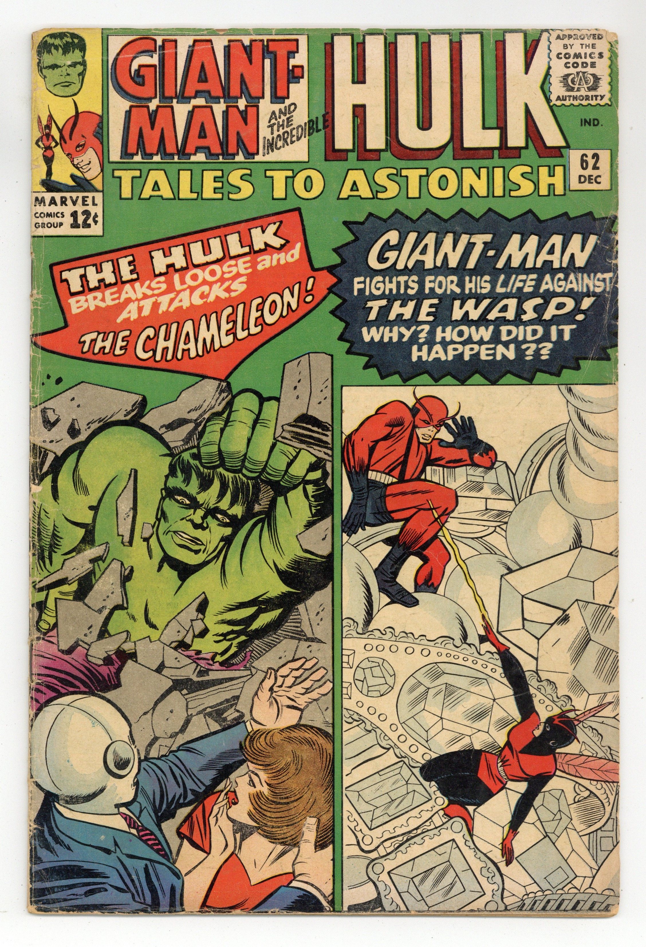 Starts Apr 20 Cover by Jack Kirby and Chic Stone. Giant-Man Versus the Wonderful Wasp!, script by Stan Lee, art by Carl Burgos and George Roussos; When Hank accidentally knocks himself out after a failed lab experiment, a petty thief makes off with his costume and begins to use the Giant-Man powers to commit crimes. Promo for Journey Into Mystery #110, Tales of Suspense #60, Strange Tales #127 and Sgt. Fury #12 reprinting their covers, art by Jack Kirby and Chic Stone. Enter...the Chameleon!, script by Stan Lee, art by Steve Ditko and George Roussos (as George Bell); The Hulk is captured in unbreakable restraints but slips through them when he turns back into Banner; Hearing that his buddy has been captured, Rick leaves Cap's side to go help his original super pal; The mysterious Leader sends the Chameleon to gamma base to find out what happened to an agent who didn't report back in. A Marvel-Masterwork Pin-Up of Hulk, art by Jack Kirby and George Roussos. 36 pgs., full color. $0.12. Cover price $0.12.