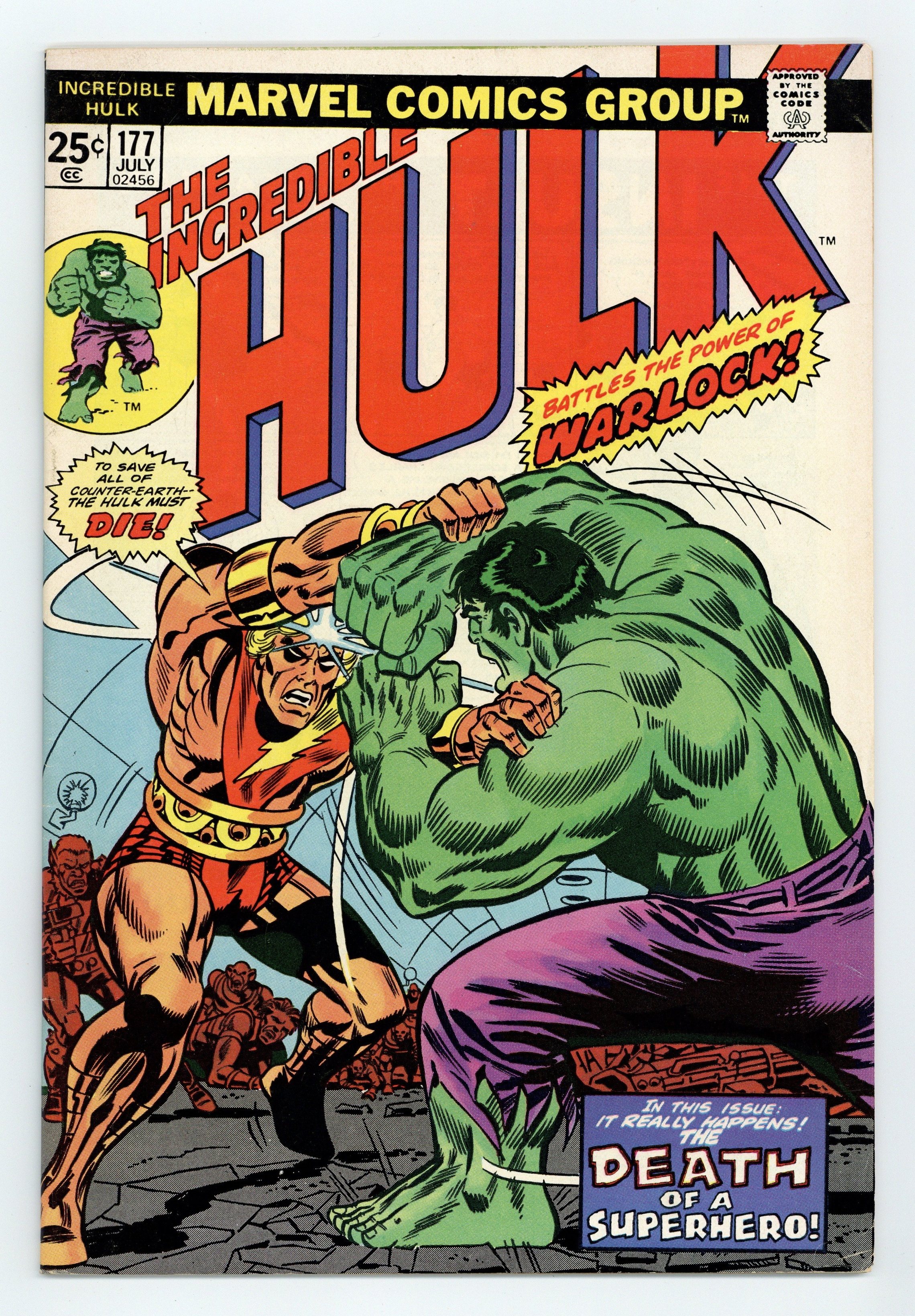 Cover pencils by Herb Trimpe, inks by Frank Giacoia. Peril of the Plural Planet! starring Adam Warlock, Man-Beast and his New Men, and the Hulk, script by Roy Thomas and Gerry Conway, pencils by Herb Trimpe, inks by Jack Abel; Hulk battles Warlock, who believes Hulk must die to save Counter-Earth. Marvel Value Stamp. 36 pgs. $0.25. Cover price $0.25.