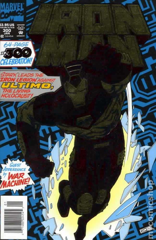 Collector's Newsstand Edition. Foil Cover - 300th Issue Celebration. "Appetite for Destruction!" Part 3 of 3. Guest-starring War Machine and the League of Iron Men. Story by Len Kaminski. Art by Kevin Hopgood, Steve Mitchell, and Tom Morgan. It's the final showdown as War Machine leads the Iron Legion into battle against Ultimo, the walking holocaust. Besides, James Rhodes decides to lend Stark a hand one more time, because if anyone is going to beat Iron Man it's going to be War Machine. 64 pages. Cover price $3.95.