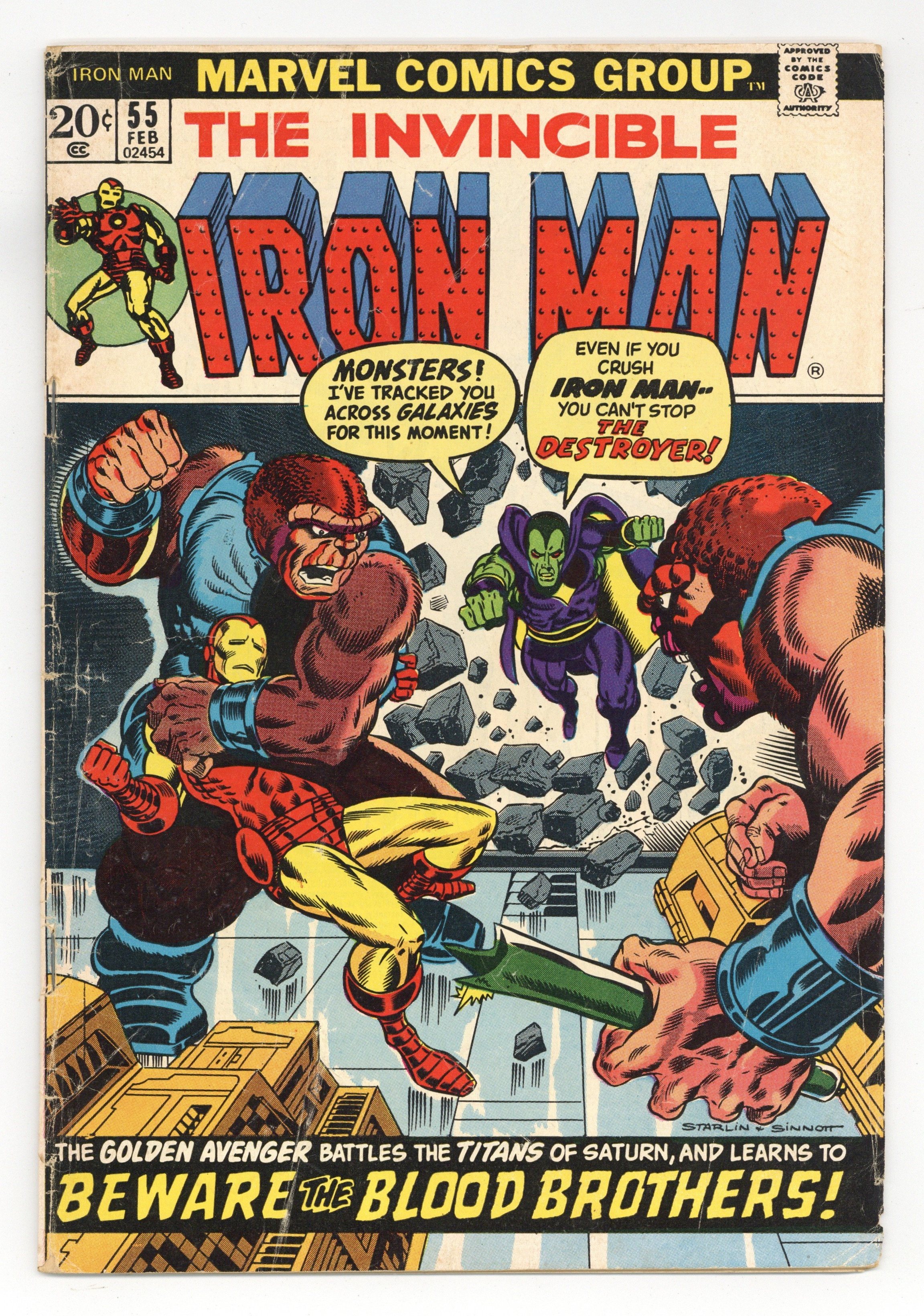 Starts Apr 4 "Beware the Blood Brothers!" First appearance of Thanos. Story by Jim Starlin. Art by Jim Starlin and Mike Esposito. Cover by Jim Starlin and Joe Sinnott. One of the landmark Marvel issues of the Bronze Age. Drax the Destroyer is a prisoner of Thanos at the evil Titan's Earth-fortress. In an effort to escape, Drax telepathically reaches out to Tony Stark for assistance; but before Iron Man can come to the rescue, Shell-Head is ambushed by the Blood Brothers! Can Drax and the golden avenger defeat the Blood Brothers and Thanos? Also first appearances of Drax the Destroyer, Starfox (in a flashback), and Mentor. (Note: Iron Man 55 was reprinted as a Marvel Milestone Edition in 1992.) 36 pages Cover price $0.20.