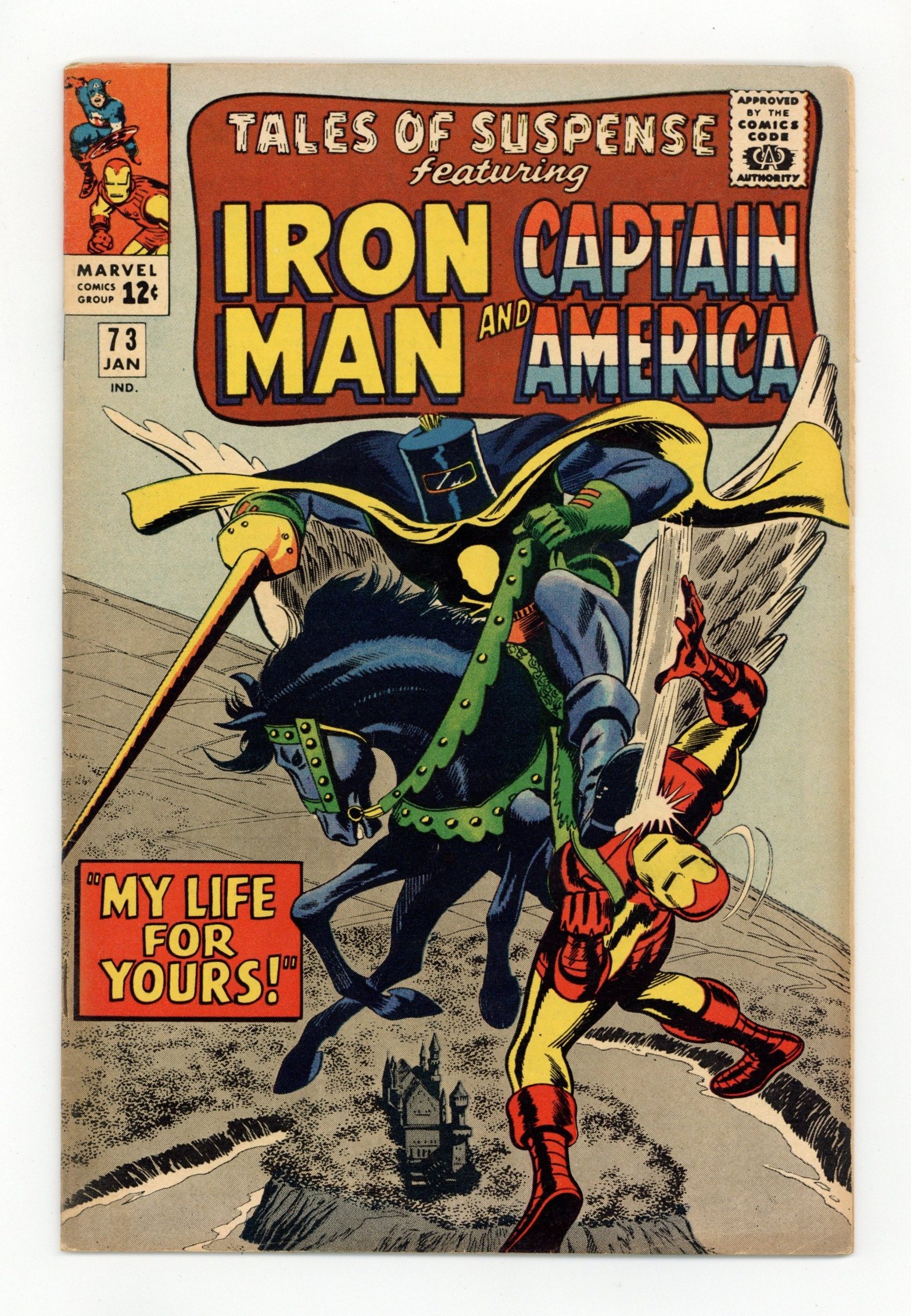 Starts Jan 3 Cover pencils by Gene Colan, inks by Jack Abel. The Black Knight guest stars in "My Life for Yours!", script by Stan Lee, Roy Thomas, and Flo Steinberg (plot assist), pencils by Gene Colan (as Adam Austin), inks by Jack Abel (as Gary Michaels); Iron Man learns that Hogan has been kidnapped from the hospital, and he follows the clues to a secret castle. "Where Walks the Sleeper!", script by Stan Lee, pencils by Jack Kirby (layouts) and George Tuska (pencils), inks by George Tuska; Captain American battles a giant robot created by the Red Skull called the Sleeper; a Nazi agent has men unleash a second Sleeper. Letter to the editor from comics writer Don McGregor. 36 pages, full color. Cover price $0.12.