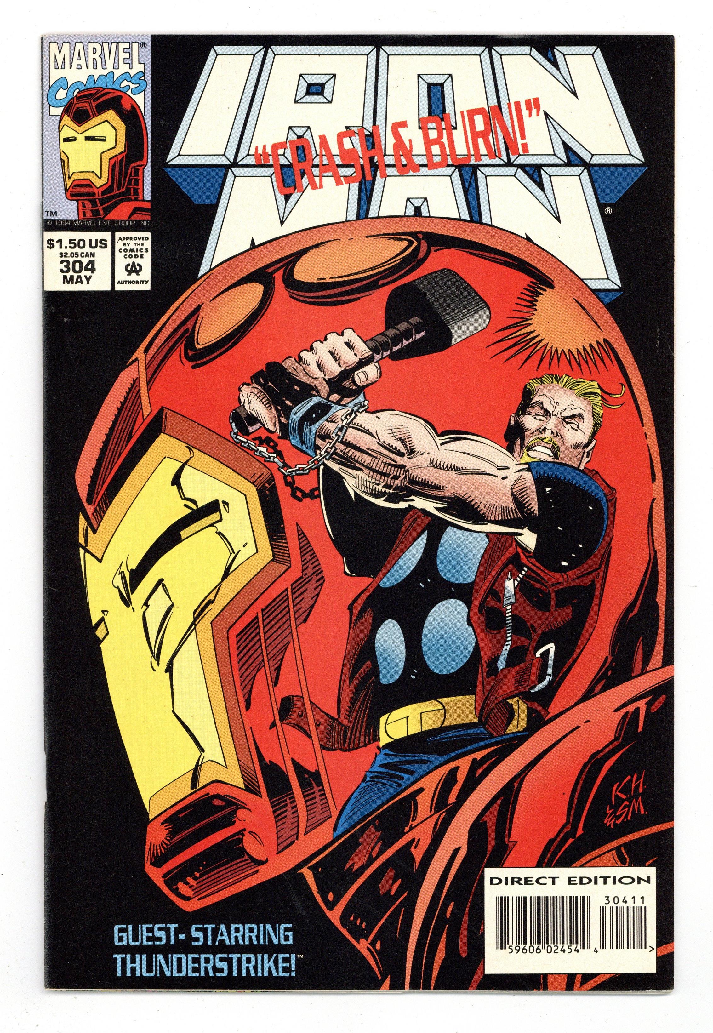 Direct Edition. Crash & Burn Part 4 of 6. "The Sound of Thunder!" Guest-starring the New Warriors and Thunderstrike. First (cameo) appearance of the Hulkbuster armor. Script by Len Kaminski. Pencils by Kevin Hopgood. Inks by Steve Mitchell. Cover by Kevin Hopgood and Steve Mitchell. It's a total disaster in Africa as the New Warriors have destroyed the hydroelectric dam! And while doing so collapsed it upon themselves and Iron Man! Slowly Shell-Head digs himself out and reaches the surface! But there he finds an angry Thunderstrike waiting! Eric Masterson is upset that the dam he designed has been reduced to rubble! And now he wants a piece of the golden avenger! However the New Warriors tell him that they destroyed the dam! And that kicks off the royal rumble: Iron Man vs. Thunderstrike vs. the New Warriors! Meanwhile at Stark Enterprises, Bethany Cabe learns that gamma bombs are being stored at a Stane International facility in Nevada! Cameo appearances by Captain America, Abe Zimmer, Mrs. Arbogast, and the Hulk. New Warriors Lineup: Firestar, Night Thrasher, Nova, Rage, and Speedball. First $1.50 issue. (Note: Night Thrasher and Iron Man meet again(concerning the same destroyed dam) in Night Thrasher (1993) #10.) 32pages. Cover price $1.50.