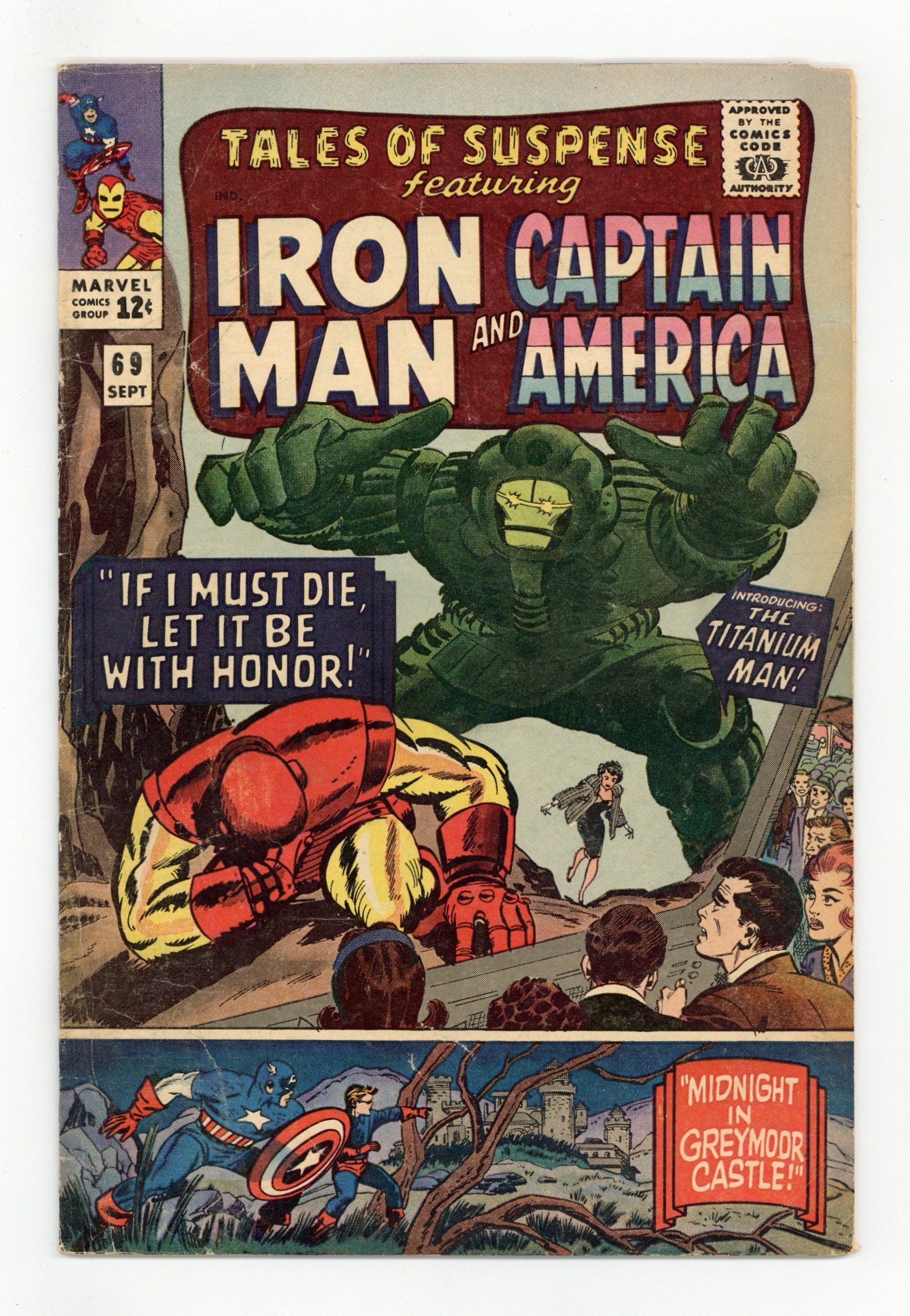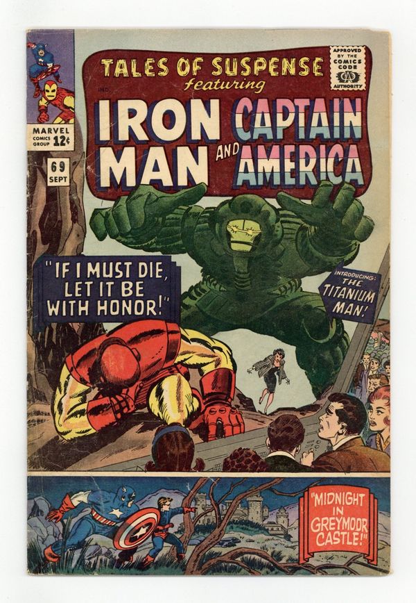 Tags: Marvel Legacy Numbering: Captain America (part 69), Marvel Legacy Numbering: Tales of Suspense (part 69), Captain America, Iron Man$19.00Cover pencils by Jack Kirby, inks by Don Heck and Mike Esposito (bottom tier only). "If I Must Die, Let It Be With Honor!", script by Stan Lee, pencils by Don Heck, inks by Vince Colletta; Communist camp commander Boris Bullski wants to take on Iron Man and releases one of his prisoners to construct an armor, making him Titanium Man. "Midnight In Greymoor Castle!", script by Stan Lee, pencils by Jack Kirby (layouts) and Dick Ayers, inks by Dick Ayers; Nazi scientist Dr. Rawlings plots against Cap and Bucky, despite his sister Celia's entreaties. 36 pages, full color. Cover price $0.12.