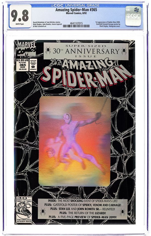 Direct Edition. 80-page giant 30th Anniversary issue, with the first appearance of Spider-Man 2099! The Lizard returns in "Fathers and Sins." Script by David Michelinie, pencils by Mark Bagley, inks by Randy Emberlin. J. Jonah Jameson is featured in "How I Created Spider-Man!" Script by David Michelinie, art by Aaron Lopresti. Gwen Stacy takes center stage in "I Remember Gwen." Script by Stan Lee, plot by Tom DeFalco, art by John Romita Sr. (Cameos by the Green Goblin and Doctor Octopus.) The Prowler is also here in "A Friend in Need." Script by Tom DeFalco, pencils by Tod Smith, inks by Andrew Pepoy. There are also two text pieces, "The Saga of Spidey's Parents" by Stan Lee, and "Spider-Man: The First Thirty Years" by Peter Sanderson. Spider-Man 2099 gets a sneak preview, with a script by Peter David, pencils by Rick Leonardi, and inks by Al Williamson. This issue was originally released with a fold-out poster of Spidey versus Venom and Carnage (poster may be missing in lower grades). 84 pgs. Cover price $3.95.
