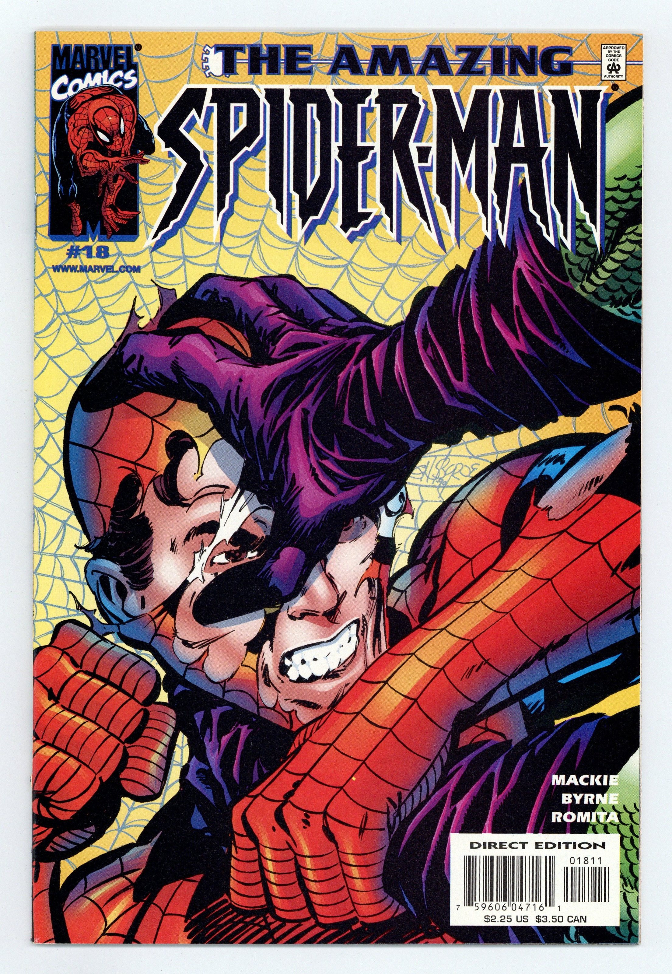 Cover by John Byrne Howard Mackie/John Byrne/John Romita Sr. Spider-Man bids farewell to penciler John Byrne... and runs face first into the returning Green Goblin! With his life in turmoil, Peter Parker has fallen from living in a swanky Fifth Avenue penthouse to existing in the streets. Worse yet, the night sky is filled with the exploding pumpkin bombs and razor bats of the Green Goblin! And as a special treat, this issue features the guest-inks of legendary Spidey artist John Romita Sr.! 36 pgs. Cover price $2.25.