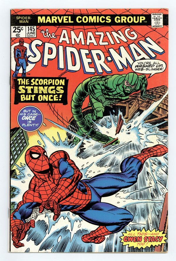 Ends Feb 16 7:12 PM CST Bid History 13 bids Current Bid $34 Your Secret Max Bid If you'd like to bid, please log in or register. "Gwen Stacy is Alive...and, Well...?!" Part 1 of 2. Script by Gerry Conway. Pencils by Ross Andru. Inks by Frank Giacoia and Dave Hunt (backgrounds). Cover by Gil Kane and John Romita. Peter Parker's world has turned upside down! Gwen Stacy is alive! Aunt May is in the hospital! And the Scorpion is on the loose! After confronting Gwen and calling her an imposter, Peter rushes to the hospital to see his aunt! Fortunately, Aunt May's condition has stabilized; so, the restless web-slinger can leave her side...and find the nearest super-villain to pound! Ironically, the deadly Scorpion is in the vicinity and looking for a good scrap too! At a nearby cement processing plant, both men get their wish! The Amazing Spider-Man vs. the sinister Scorpion! A terrific fight! Cameo appearances by Anna Watson, Ned Leeds, Betty Brant, Joe Robertson, and Mary Jane Watson. Flashback cameo by the Green Goblin (aka Norman Osborn). (Note: The plot crosses over with Marvel Team-Up 33). The Scorpion previously appeared in Captain America 152. The letters page includes Marvel Value Stamp series A #100 Galactus by Jack Kirby. This story was reprinted in Marvel Tales 122. 36 pages. 25c cover price. Cover price $0.25.