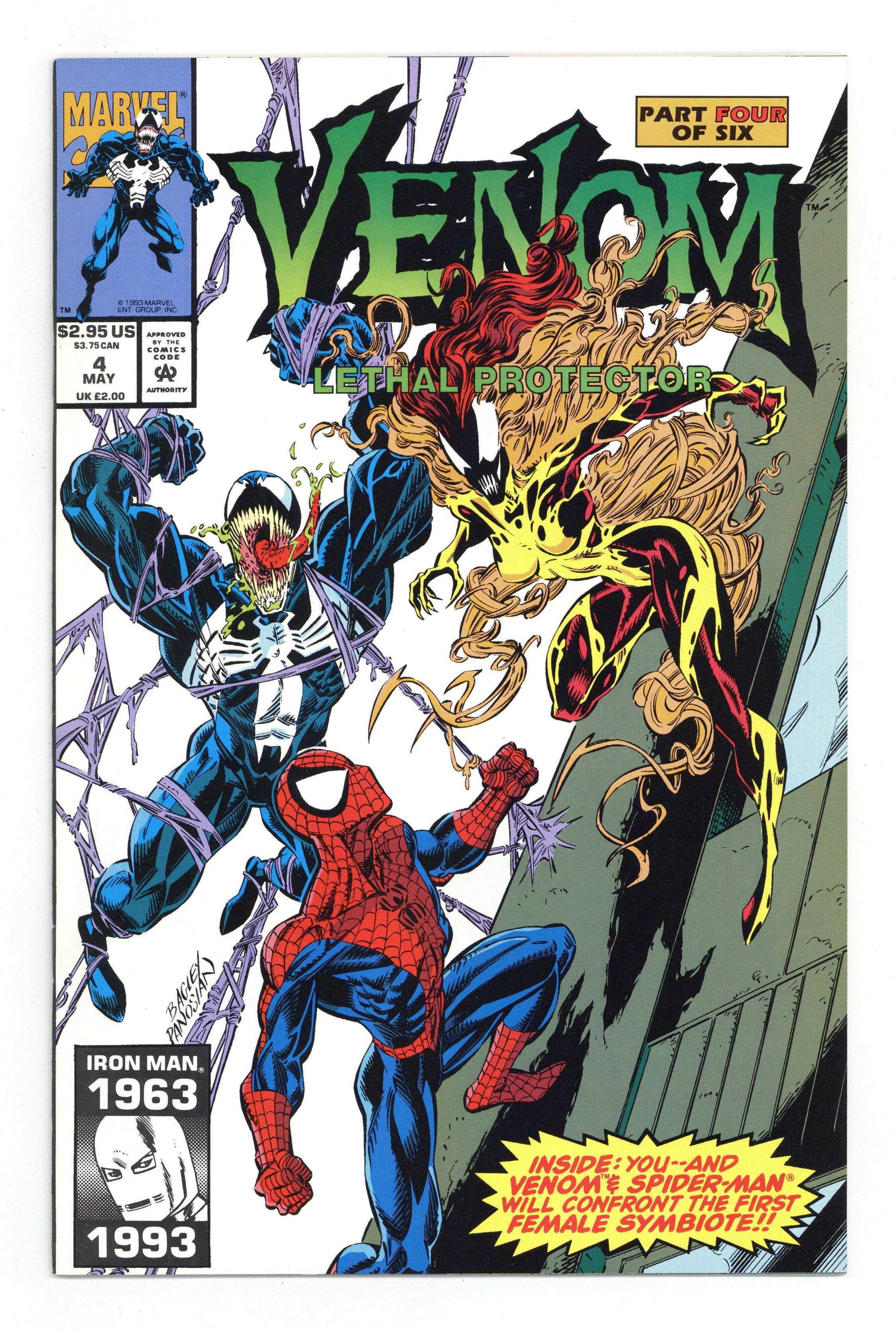 Tags: Marvel Legacy Numbering: Venom (part 4), Spider-Man$8.00Direct Edition. The first female symbiote enters the scene! Spider-Man and Venom confront the Life Foundation's master plan, when a new killer symbiote is born. Written by David Michelinie. Art by Ron Lim, Sam de la Rosa and Al Milgrom. Cover by Mark Bagley and Dan Panosian. Cover price $2.95.