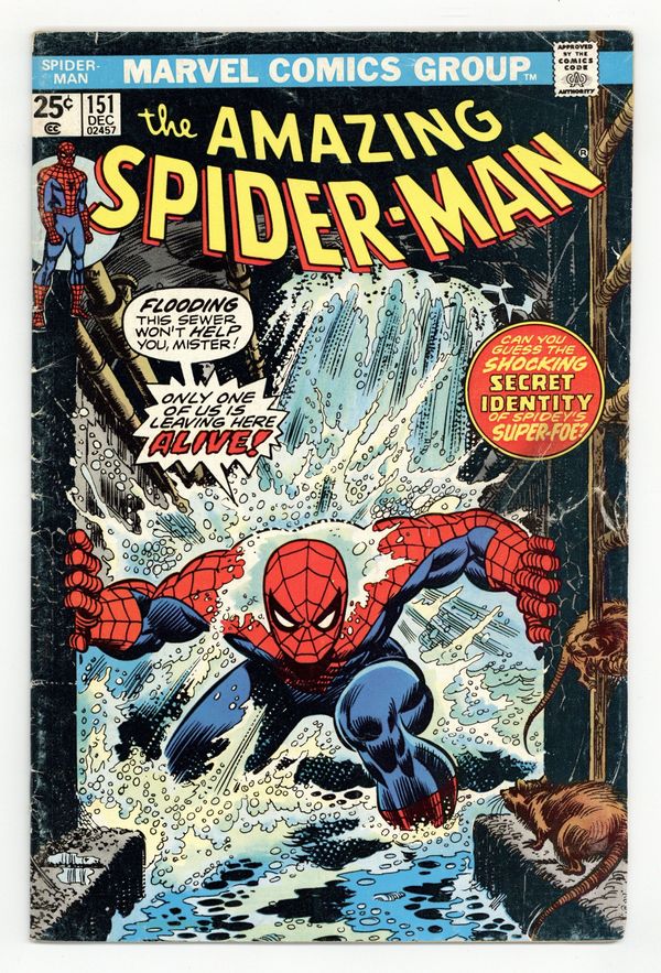 Tags: Marvel Legacy Numbering: Amazing Spider-Man (part 151), Spider-Man Clone Saga (part 00L)$36.00"Skirmish Beneath the Streets!" Part 1 of 2. Script by Len Wein. Pencils by Ross Andru. Inks by John Romita Sr., Mike Esposito, Frank Giacoia, and Dave Hunt (backgrounds). Cover by John Romita Sr. One of the best Spider-Man covers of the bronze age kicks off a new era for the wondrous wall-crawler! And JJJ begins the fun by hosting a party in honor of Ned and Betty's engagement! The flattop curmudgeon is in rare form and about to make a speech when the lights suddenly go out! What happened to the NYC power grid? Maybe it was a shock(er) to the system! The web-slinger descends into the sewers to find out! Appearances by Mary Jane Watson, Flash Thompson, Harry Osborn, Betty Brant, Ned Leeds, J. Jonah Jameson, and Joe Robertson. (Notes: In this issue Spider-Man disposes of his clone's body at the Brooklyn incinerating plant before attending Jonah's party. Thus, ending the saga of the Spider-Clone. Or so Spidey and all his fans thought. The Shocker previously appeared in Amazing Spider-Man 72. The cover to this issue is a homage to the classic cover of Amazing Spider-Man 33. Len Wein begins his memorable two-and-a-half year run as the writer of the Amazing Spider-Man title. This story was reprinted in Marvel Tales 128.) 36 pages. Cover price $0.25.