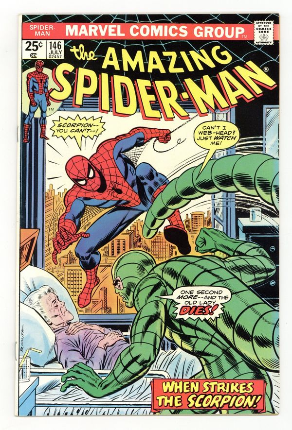 "Scorpion...Where is thy Sting?" Part 2 of 2. Script by Gerry Conway. Pencils by Ross Andru. Inks by John Romita Sr., John Romita, Jr., Mike Esposito, Frank Giacoia, and John Tartaglione. Cover by John Romita Sr. While Aunt May's nephew comes to grips with the return of Gwen Stacy (clone), the devious Jackal once more plots the wall-crawler's violent demise! And this time he uses the unsuspecting Scorpion as his pawn! The Scorpion thought he killed Spidey last issue, but once Mac Gargan learns the truth; he wants another shot! So the Jackal tells him to look in May Parker's hospital room! What a cruel thing to do! And as depicted on the dynamic cover, the Scorpion indeed pays Aunt May a visit! But the super-villain with a sting wasn't counting on a fighting mad web-slinger in the waiting room! The beleaguered Scorpion doesn't stand a chance! Elements of the story continue in Giant-Size Spider-Man 5. (Note: The Scorpion returns in Ms. Marvel (1977 1st series #1. The letters page includes Marvel Value Stamp series A #67 Cyclops by George Tuska. This story was reprinted in Marvel Tales 123.) 36 pages. 25c cover price. Cover price $0.25.