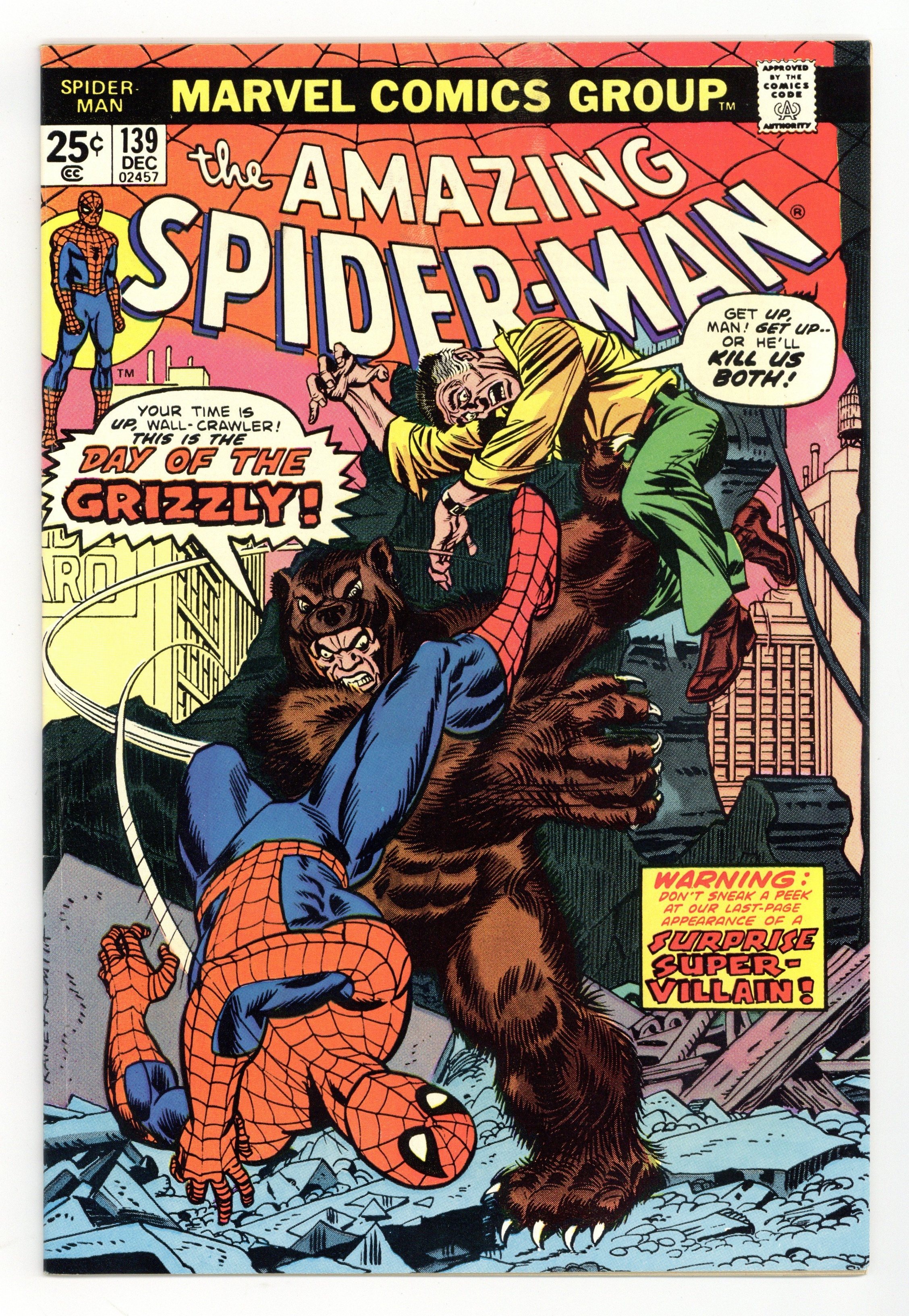 Tags: Marvel Legacy Numbering: Amazing Spider-Man (part 139), Spider-Man$21.00"Day of the Grizzly!" Part 1 of 2. Script by Gerry Conway. Pencils by Ross Andru. Inks by Frank Giacoia and Dave Hunt (backgrounds). Cover by Gil Kane (pencils) and John Romita Sr. (inks). Peter Parker finds a new place to live at 410 Chelsea Street! And when he stops by the Daily Bugle to tell his friends...the Grizzly attacks! Whoa, were did this 9-foot super-villain come from? There's no time for questions or answers as the web-slinger leaps into action! But the Grizzly is loaded for bear and then some! All the amazing one can do is save J. Jonah Jameson while the Grizzly escapes! However courtesy of the Jackal, the rematch is coming next issue! First appearance of the Grizzly. Cameo appearances by Betty Brant, Liz Allan, and Joe Robertson. (Notes: The letters page includes Marvel Value Stamp series A #42 Man-Wolf by Gil Kane and Mike Esposito. This story was reprinted in Marvel Tales 116.) 36 pages. 25c cover price. Cover price $0.25.