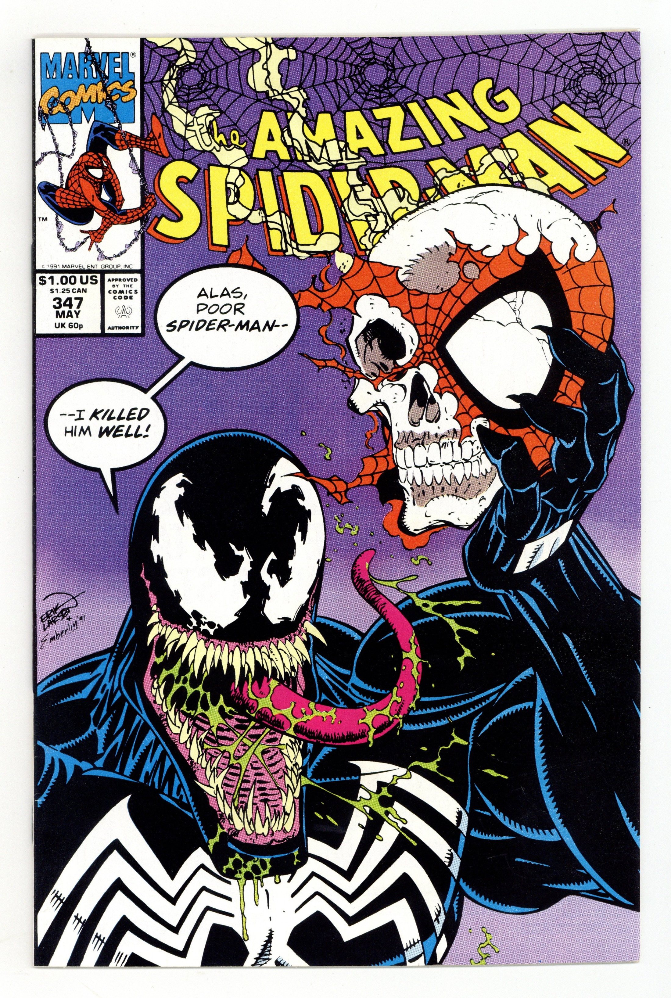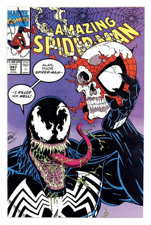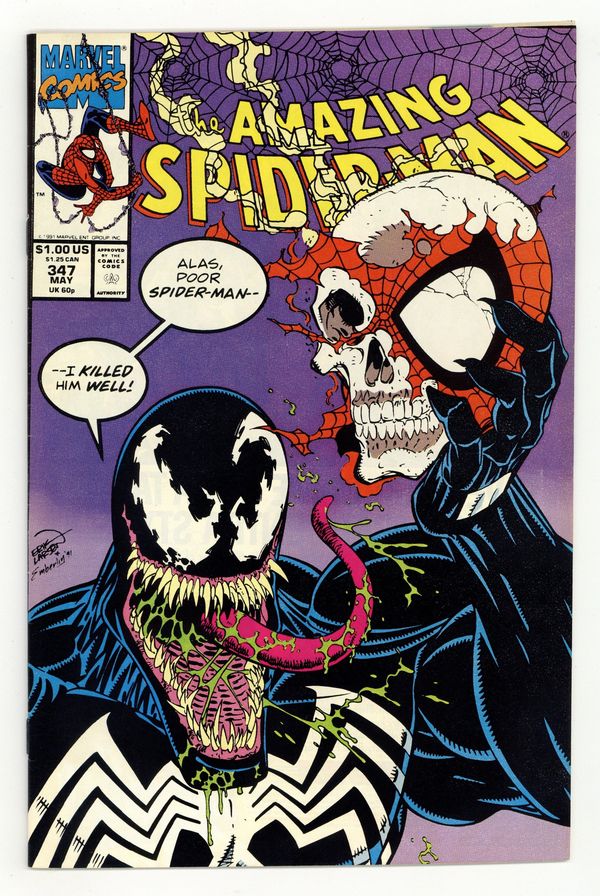 Tags: Marvel Legacy Numbering: Amazing Spider-Man (part 347), Spider-Man$26.00Direct Edition. "The Boneyard Hop!" Part 2 of 2. Script by David Michelinie. Pencils by Erik Larsen. Inks by Randy Emberlin. Cover by Erik Larsen and Randy Emberlin. On a deserted island, the Amazing Spider-Man wages a desperate battle for survival vs. the vicious Venom! The wall-crawler is fighting for his life! While Venom is fighting for his death! And this time there isn't any help or rescue on the way! As shown on the twisted cover, Venom plans to quote Hamlet once the battle is over! If the spectacular one doesn't want to play the part of Yorick; he better move fast! To thine own self be true, web-slinger! Cameo appearances by Mary Jane Watson, Willie Lumpkin, Aunt May, Flash Thompson, and the Black Cat. (Notes: Venom appears next in Darkhawk 13 & 14. This two-part story was reprinted in the trade paperbacks: Spider-Man: Venom Returns (1993) and Spider-Man: The Vengeance of Venom (2011).) 36 pages. Cover price $1.00. Cover price $1.00.