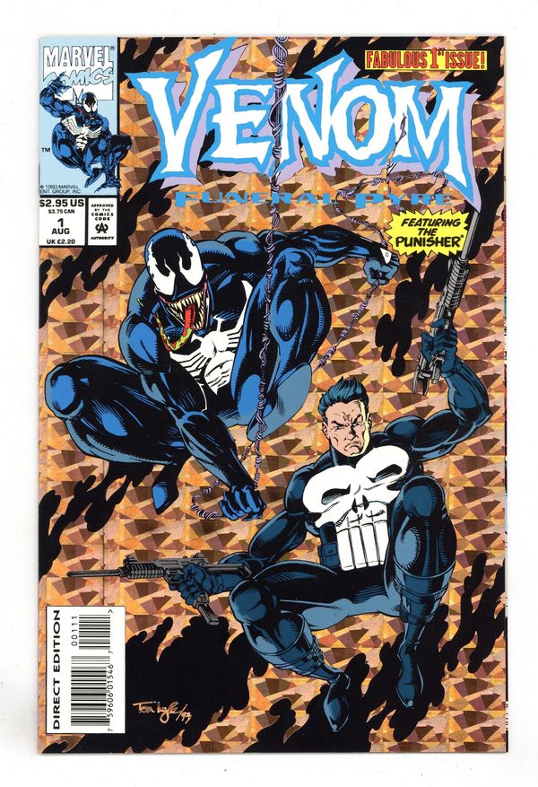 Direct Edition. Gold holographic cover. The Punisher guest stars in this 3-issue limited series, and the team up of two of Marvel's most popular characters is commemorated with a cover enhanced with flaming holografx foil that simulates the flickering effect of real fire. Then meet an all new villain! Written by Carl Potts. Art by Tom Lyle, Joe Rubinstein, Scott Hanna and Al Milgrom. Cover by Tom Lyle. Cover price $2.95.