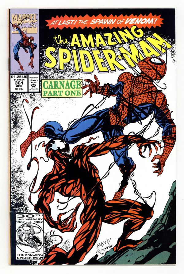 Tags: Marvel Legacy Numbering: Amazing Spider-Man (part 361), Spider-Man$73.00First Printing. Direct Edition. First (full) appearance of Carnage in "Savage Genesis!" Part 1 of 3. Script by David Michelinie. Pencils by Mark Bagley. Inks by Randy Emberlin. Cover by Mark Bagley and Randy Emberlin. Blood runs in the streets as a serial killer roams New York City! And as the web-slinger investigates the murders, he notices a very disturbing similarity to another killer's modus operandi! In a burned-out building in Brooklyn, the spectacular one comes face-to-face with his new homicidal foe...Carnage! Can the wall-crawler end Cletus Kasady's rampage in their very first encounter? Cameo appearances by Aunt May and Mary Jane Watson. Flashback cameo by Venom. (Note: This three-part story was reprinted in 2011 in the trade paperback: Spider-Man -- The Vengeance of Venom.) 36 pages, full color. $1.25 cover price. NOTE: Most of these were distributed with slight printer tears in the bottom edge of the cover. Cover price $1.25.