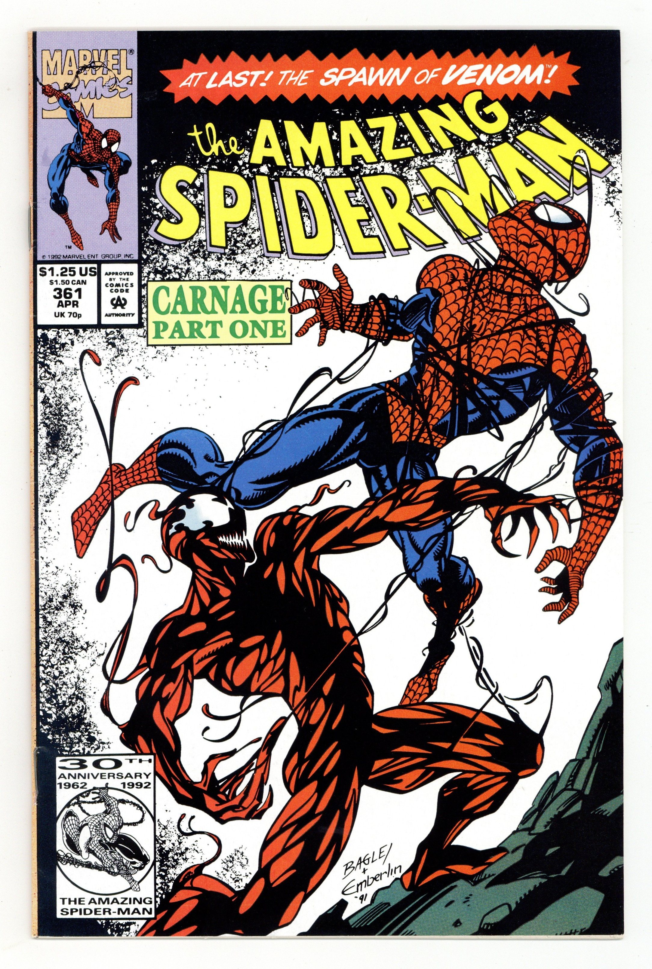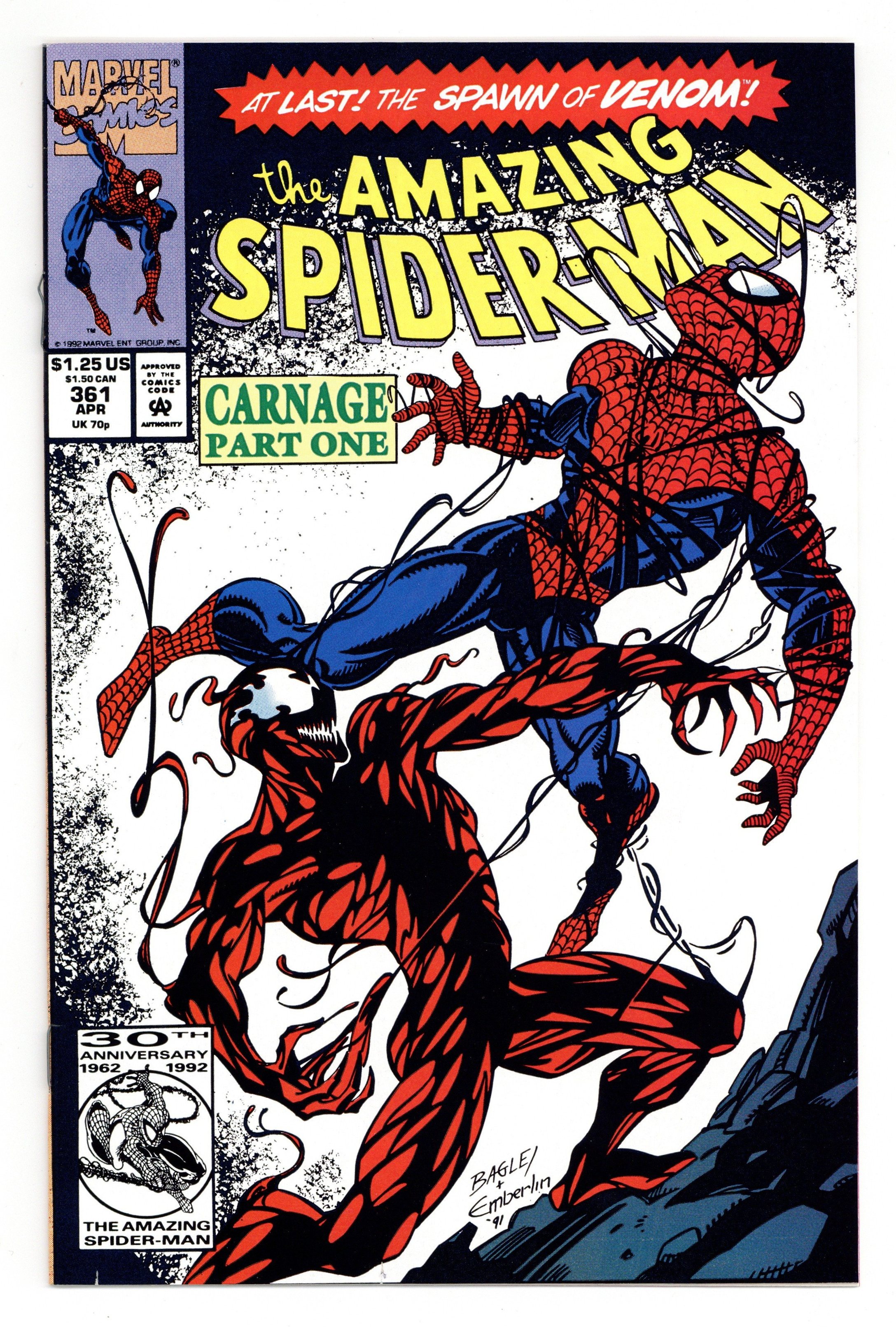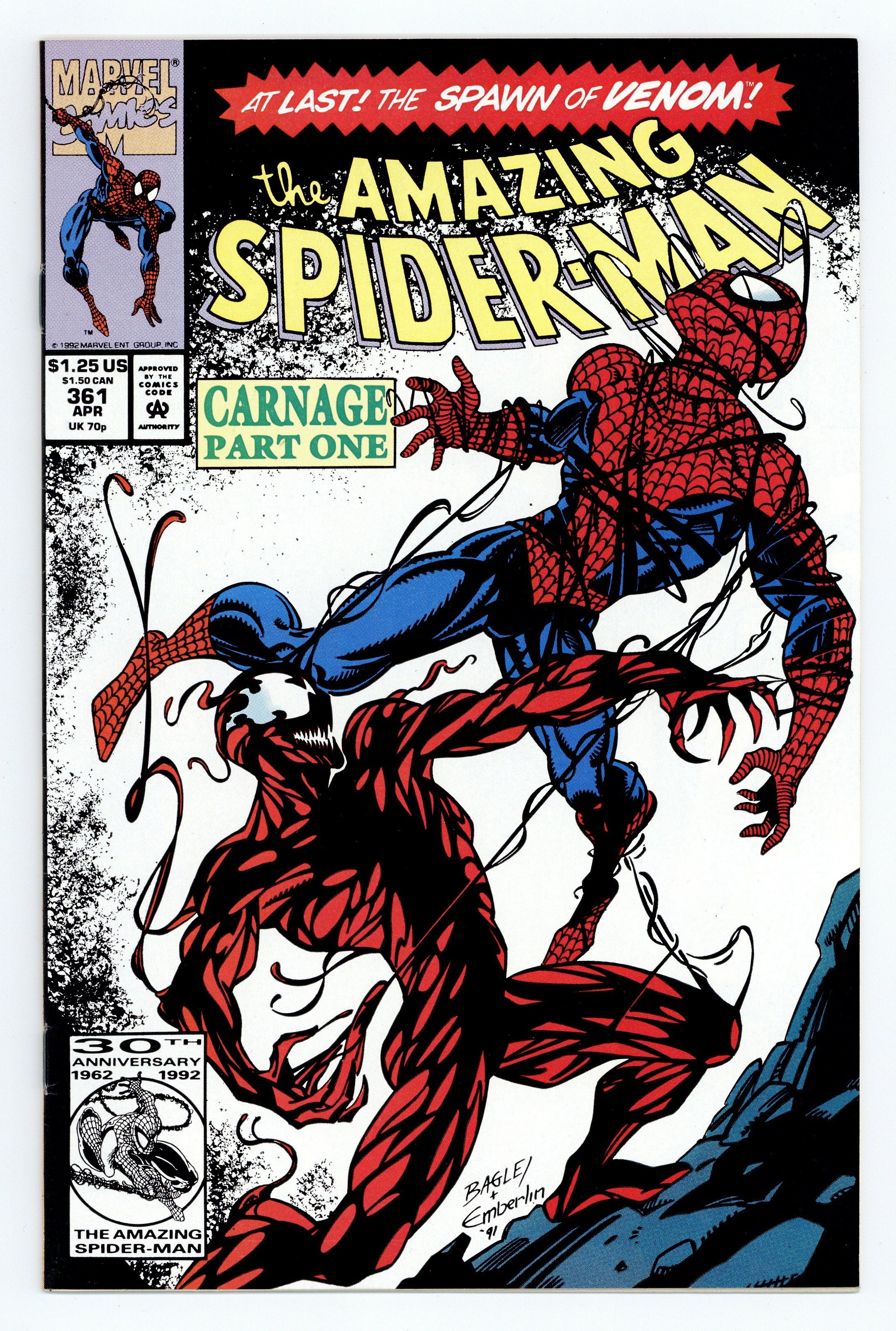 Tags: Marvel Legacy Numbering: Amazing Spider-Man (part 361), Spider-Man$90.00First Printing. Direct Edition. First (full) appearance of Carnage in "Savage Genesis!" Part 1 of 3. Script by David Michelinie. Pencils by Mark Bagley. Inks by Randy Emberlin. Cover by Mark Bagley and Randy Emberlin. Blood runs in the streets as a serial killer roams New York City! And as the web-slinger investigates the murders, he notices a very disturbing similarity to another killer's modus operandi! In a burned-out building in Brooklyn, the spectacular one comes face-to-face with his new homicidal foe...Carnage! Can the wall-crawler end Cletus Kasady's rampage in their very first encounter? Cameo appearances by Aunt May and Mary Jane Watson. Flashback cameo by Venom. (Note: This three-part story was reprinted in 2011 in the trade paperback: Spider-Man -- The Vengeance of Venom.) 36 pages, full color. $1.25 cover price. NOTE: Most of these were distributed with slight printer tears in the bottom edge of the cover. Cover price $1.25.