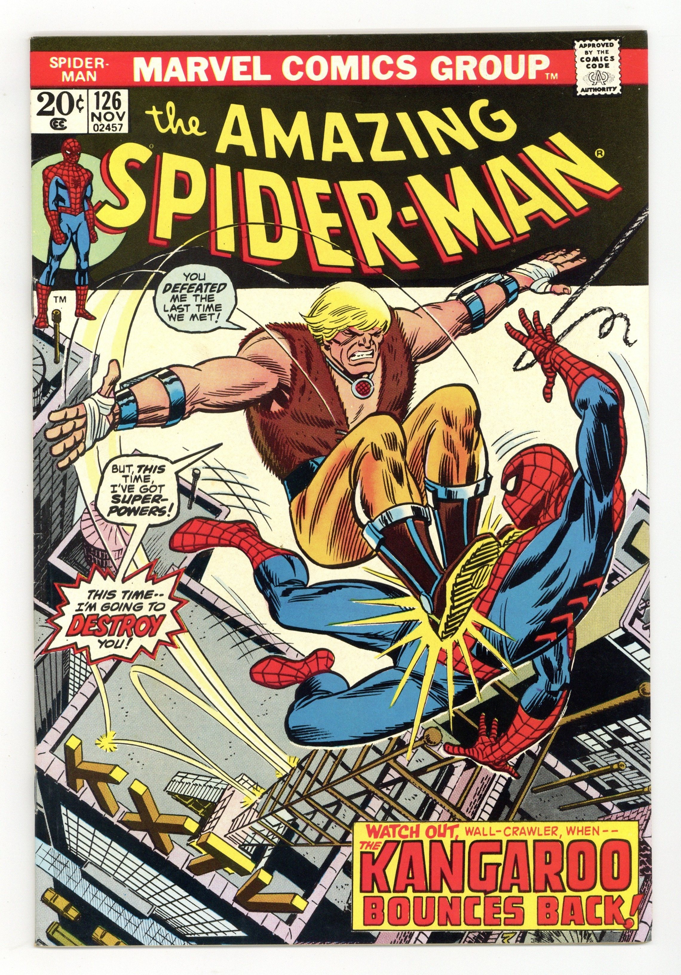 Tags: Marvel Legacy Numbering: Amazing Spider-Man (part 126), Spider-Man$29.00"The Kangaroo Bounces Back!" Script by Gerry Conway. Pencils by Ross Andru. Inks by Jim Mooney. Cover by John Romita. On a rooftop near the Empire State University campus, two advertising executives call out to Spider-Man! Surprisingly, they want the web-slinger to be the spokesman for a new car! At first Spidey declines, but later he changes his mind -- even though he must design the car himself. So it's time to pay a visit to Johnny Storm (aka the Human Torch) for help! Meanwhile, the Kangaroo is back in town. And after receiving a power boost from the creepy Dr. Jonas Harrow, he clashes with the wall-crawler at the Hudson Nuclear Laboratories! Beware of the radioactive isotopes! Lastly, Harry Osborn accepts his family legacy and assumes the mantle of the Green Goblin! Cameo appearances by Aunt May, Mary Jane Watson, Flash Thompson, Professor Miles Warren, John Jameson, Kristine Saunders, and J. Jonah Jameson. (Notes: The Kangaroo previously appeared in Amazing Spiderman #81. This story was reprinted in Marvel Tales 103.) 32 pages. Cover price $0.20.