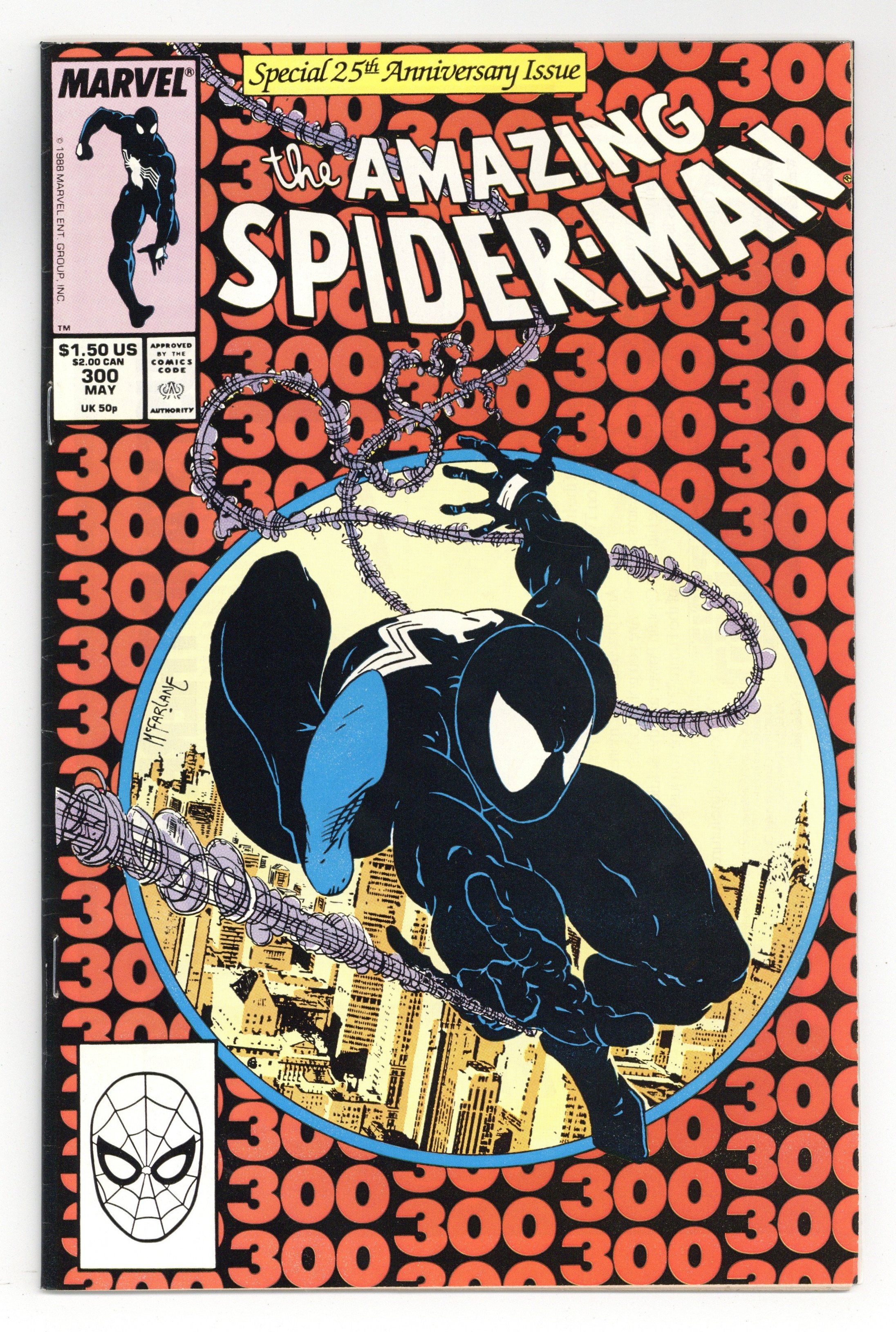 Direct Edition. Giant-sized 25th anniversary issue. First full appearance of Venom in "Venom!", script by David Michelinie, art by Todd McFarlane; Spidey's old alien costume has merged with reporter Eddie Brock who thinks his career was ruined by Spider-Man and the symbiote of the two, Venom, takes on the web slinger; At MJ's request, Spidey returns to the blue and red costume as she now finds his black duds way too creepy; This is the last issue in which Spider-Man appears in his black costume; Thing (of the Fantastic Four) cameo.. Stan's Soapbox Special in place of letters page: Full page editorial by Stan on the occasion of Spider-Man's 300th issue. 52 pgs., full color. Cover price $1.50.