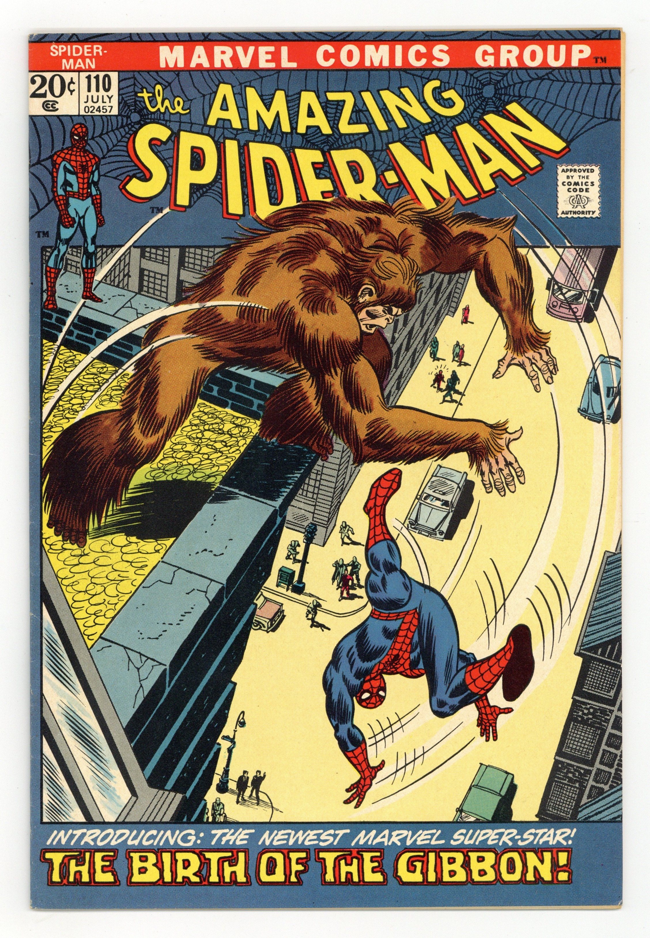 First appearance of the Gibbon in "The Birth of the Gibbon!" Part 1 of 2. Script by Stan Lee. Pencils by John Romita. Inks by John Romita and Tony Mortellaro (backgrounds). Cover by John Romita and Frank Giacoia. On a Manhattan rooftop, the wall-crawler has a chance meeting with a man named Martin Blank. And after he talks with Spider-Man; the tall, lanky, and athletic Martin decides to become a superhero! But when Martin (in his ape costume) meets the web-slinger again, Spider-Man laughs at his offer to become partners, and Martin is hurt. And now the Gibbon is vulnerable to becoming partners...with someone else! Origin of the Gibbon. Cameo appearances by Aunt May, Gwen Stacy, Harry Osborn, Flash Thompson, and Kraven the Hunter. (Notes: This story completes Stan Lee's extraordinary scripting run on the Amazing Spider-Man title -- which began with issue #1in 1963. The letters page includes a letter from comics writer David Michelinie. This issue was reprinted in Marvel Tales #89.) 36 pages. Cover price $0.20.