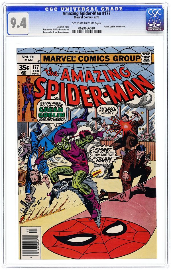 Tags: Marvel Legacy Numbering: Amazing Spider-Man (part 177), Spider-Man$11.00"Goblin in the Middle" Part 2 of 5. Script by Len Wein. Art by Ross Andru (breakdowns) and Mike Esposito (finishes). Cover by Ross Andru and Joe Sinnott. After saving Flash Thompson from a deadly fall, the wall-crawler takes a break (from his pursuit of the goblin) to visit his dear aunt in the hospital. Fortunately, Aunt May seems to be doing much better! Later that night the web-slinger hears about an underworld meeting taking place at the World Trade Center! The amazing one swings over to the twin towers ready to bust up Silvermane's party, but the Green Goblin gets there first! Is the goblin going to clash or collude with Silvermane? Either way it spells trouble for your friendly neighborhood Spider-Man! Cameo appearances by Flash Thompson, Harry Osborn, Anna Watson, and Mary Jane Watson. Flashback cameos by Norman Osborn and Gwen Stacy. (Note: Silvermane formerly appeared in Daredevil 123.) 36 pages. Cover price $0.35.