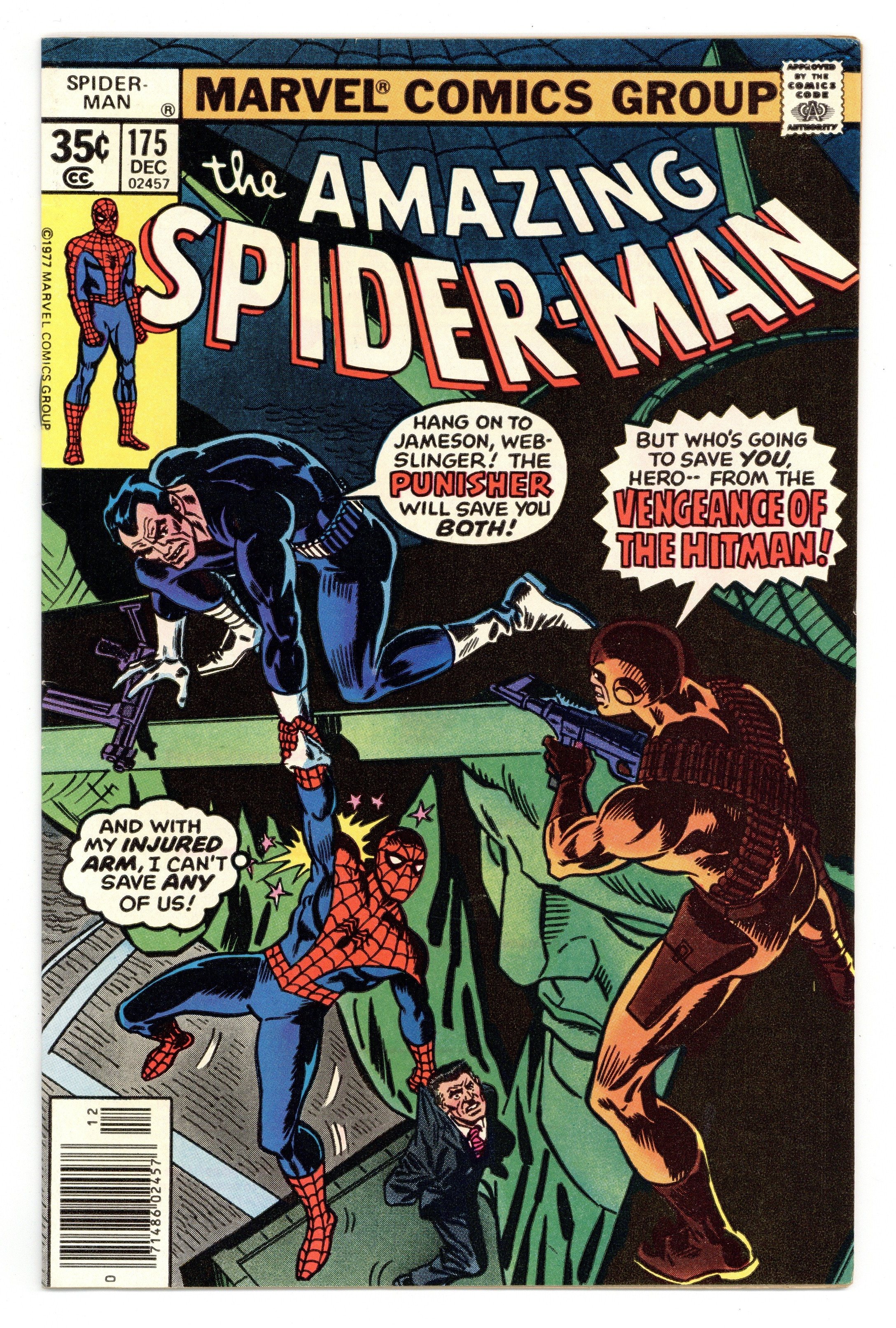 Tags: Marvel Legacy Numbering: Amazing Spider-Man (part 175), Spider-Man$18.50"Big Apple Battleground!" Part 2 of 2. Guest-starring the Punisher. Script by Len Wein. Art by Ross Andru (breakdowns) and Jim Mooney (finishes). Cover by Ross Andru and Frank Giacoia. It's a spectacular shootout atop the Statue of Liberty! The inscription at the statue's base calls for the tired, poor, and huddled masses; but tonight, lady liberty is instead receiving the homicidal, vengeful, scared, and amazing! In the persons of the Hitman, Punisher, J. Jonah Jameson, and Spider-Man! Three of the men will survive their harrowing encounter. One will not. An outstanding issue! Final appearance of the Hitman. Cameo appearances by Harry Osborn, Flash Thompson, Joe Robertson, Dr. Marla Madison, and Dr. Bart Hamilton. (Notes: The Punisher appears next in Captain America 241. This story was reprinted in Marvel Tales 217.) 36 pages. Reprinted in Marvel Tales # 217. Cover price $0.35.