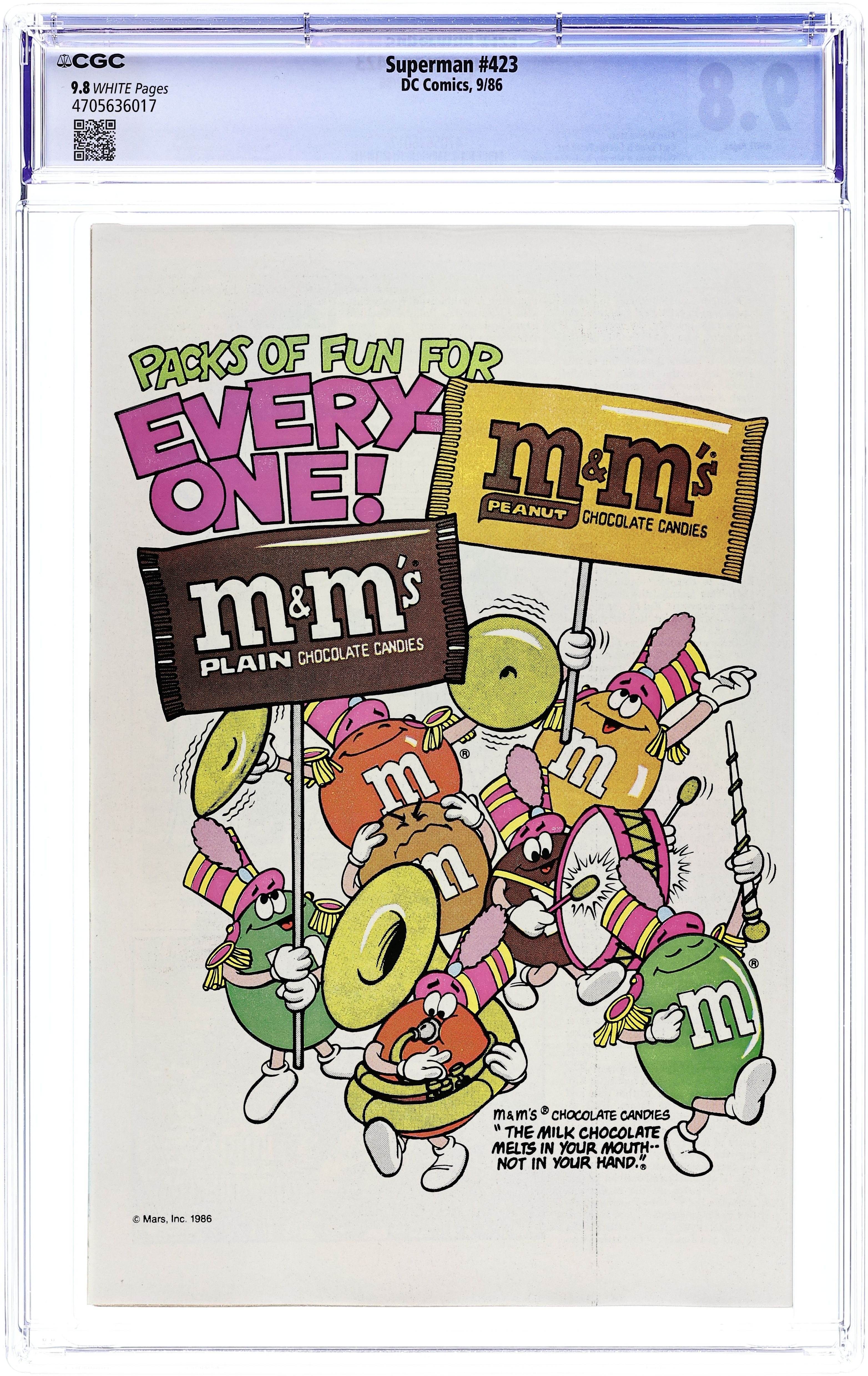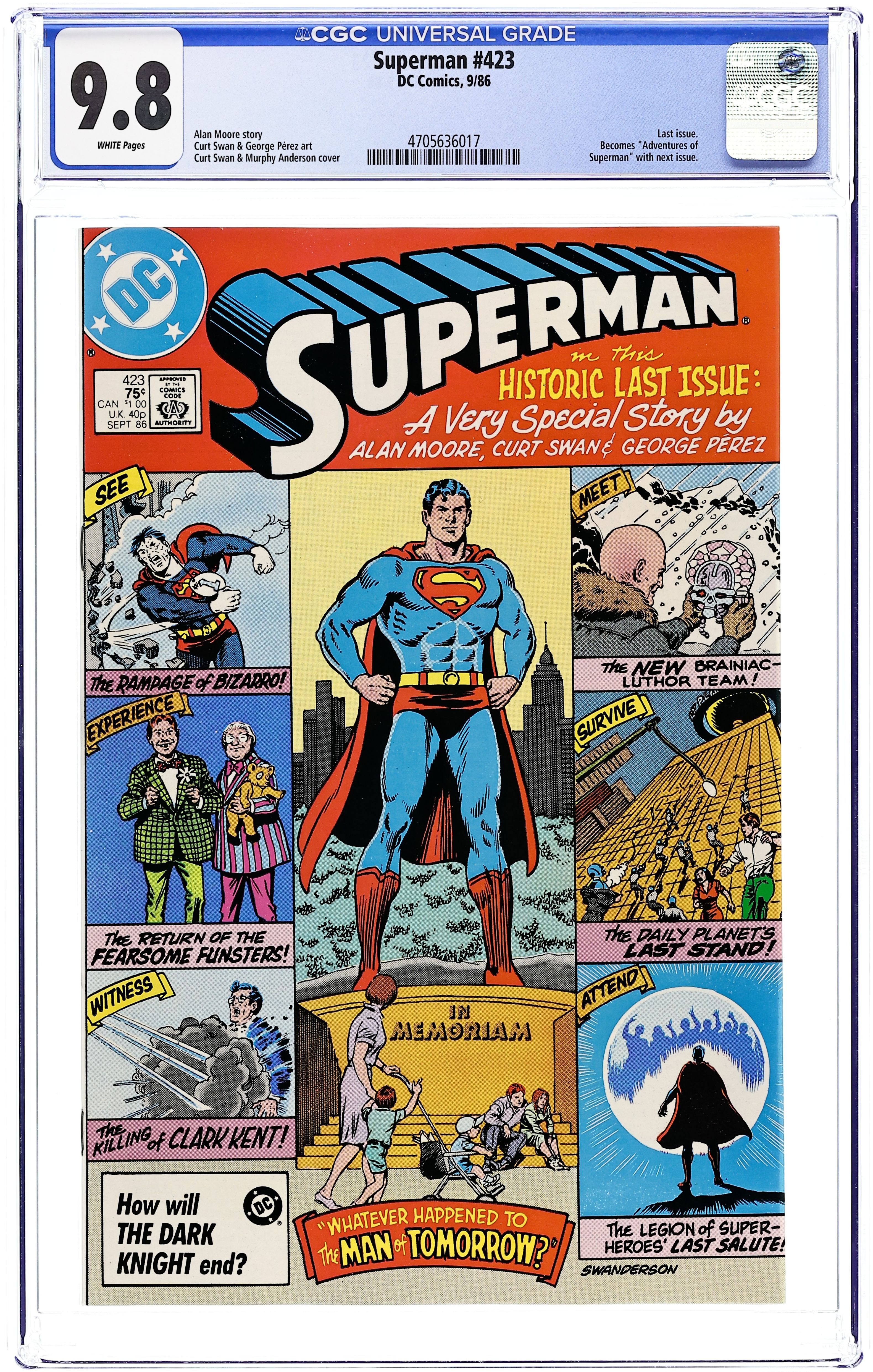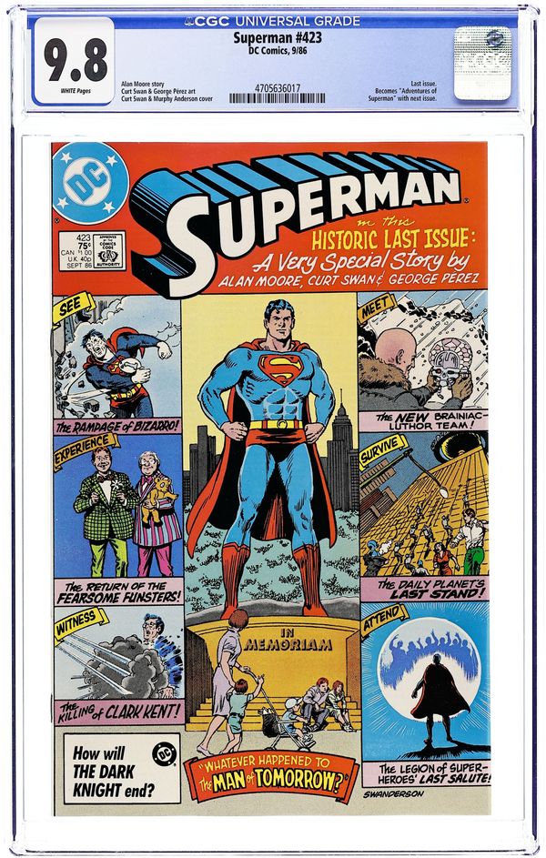 Direct Edition. "Whatever Happened to the Man of Tomorrow?" Part 1, continues in Action Comics #583. Art by Curt Swan. Inks by George Pérez. These two issues are the final pre-Crisis Superman issues. Written by Alan Moore. 36 Pages, Full Color. Cover price $0.75.