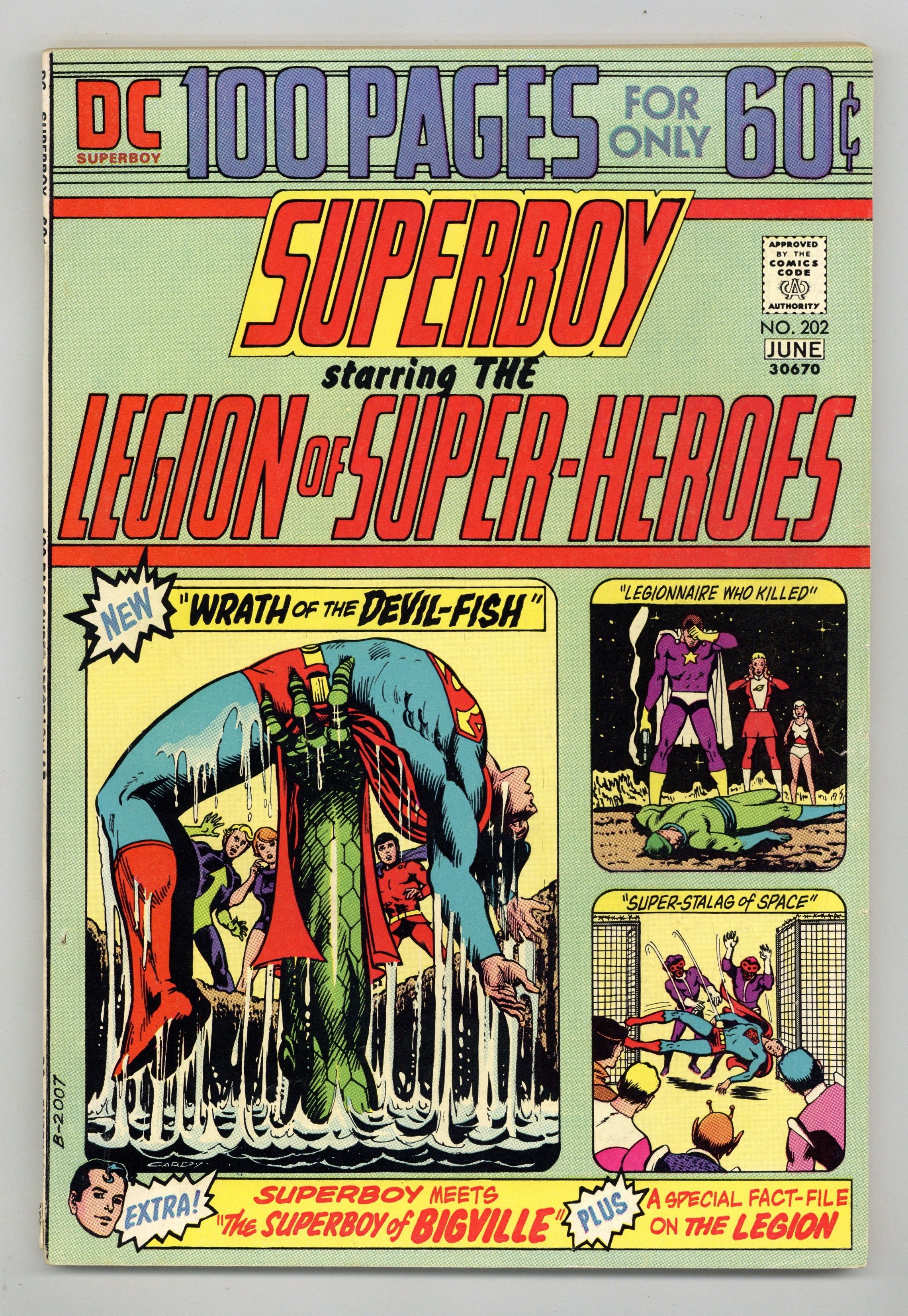 100-page giant. New Legion of Super-Heroes stories "Lost: A Million Miles From Home" (script by Cary Bates, pencils by Dave Cockrum, inks by Mike Grell) and "The Wrath of the Devil-Fish" (script by Bates, art by Cockrum). Legion reprints: "The Legionnaire Who Killed" (script by Edmond Hamilton, pencils by Curt Swan, inks by Sheldon Moldoff and George Klein; from Adventure Comics 342), "The Super-Stalag of Space" (script by Hamilton, art by Swan/Klein; from Adventure 344), and "The Execution of Matter-Eater Lad" (script by Hamilton, art by Swan/Klein; from Adventure 345). Superboy reprint, "The Superboy of Bigville" (art by Swan/Klein; from Superboy 91). Four-page "Lore of the Legion" character profiles. Cover by Nick Cardy. Statement of ownership--average print run 533,600; average paid circulation 238,992. 100 Pages, Full Color. Cover price $0.60.