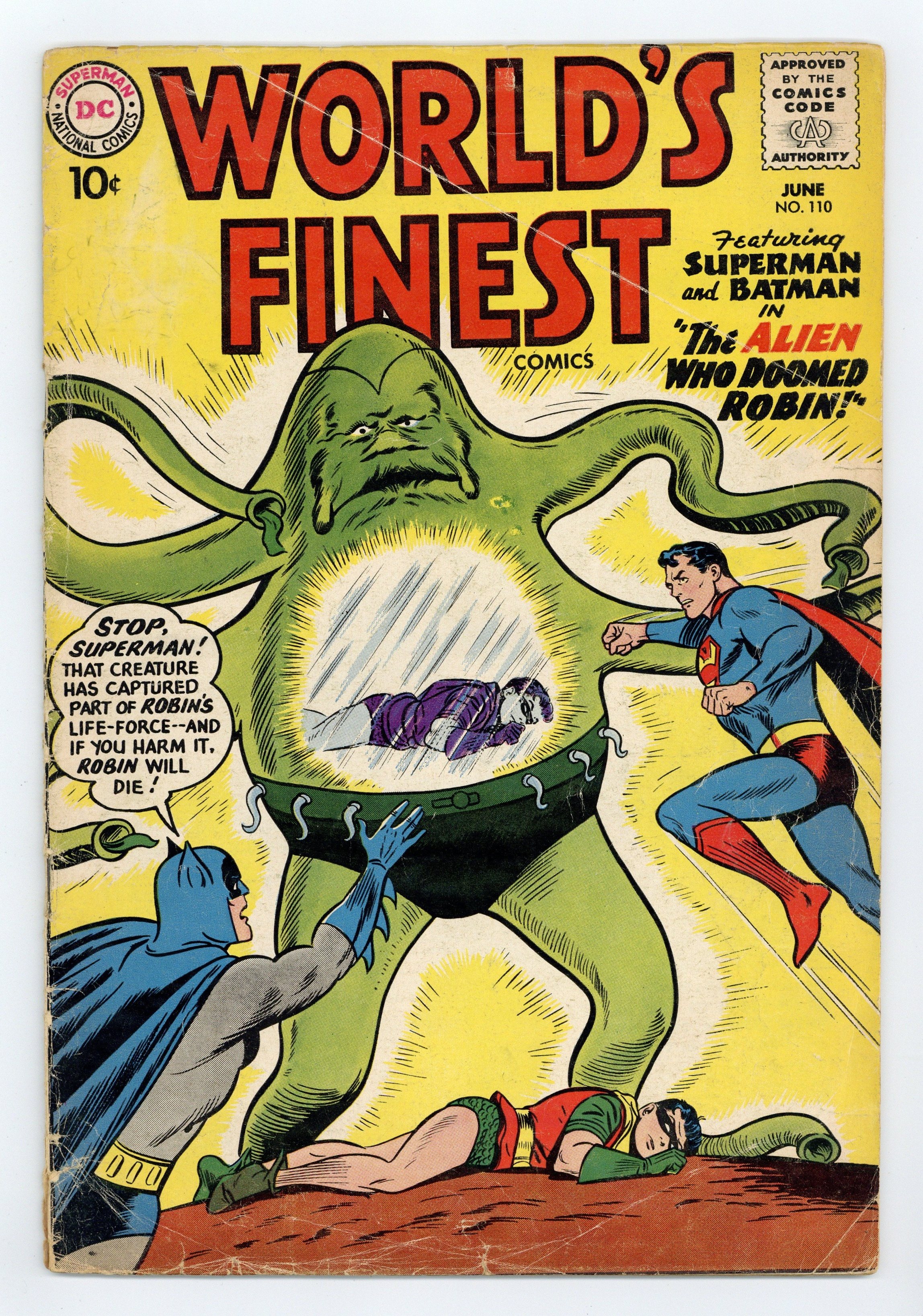 Cover pencils by Curt Swan, inks by Sheldon Moldoff. The Alien Who Doomed Robin starring Superman and Batman, script by Jerry Coleman, pencils by Dick Sprang, inks by Sheldon Moldoff; An alien arrives on Earth and starts shrinking buildings and stealing them; He plans to enlarge them on his homeworld and create a tourist attraction in space; Superman, Batman and Robin must stop him and return the shrunken buildings to their proper locations. Ollie humor page by Henry Boltinoff. The Robot Raiders starring Tommy Tomorrow, art by Jim Mooney. The Sinister Spectrum Man starring Green Arrow, script by Ed Herron, art by Lee Elias; Green Arrow and Speedy must find a way to stop the Spectrum Man and his gang of thieves. 36 Pages, Full Color. Cover price $0.10.