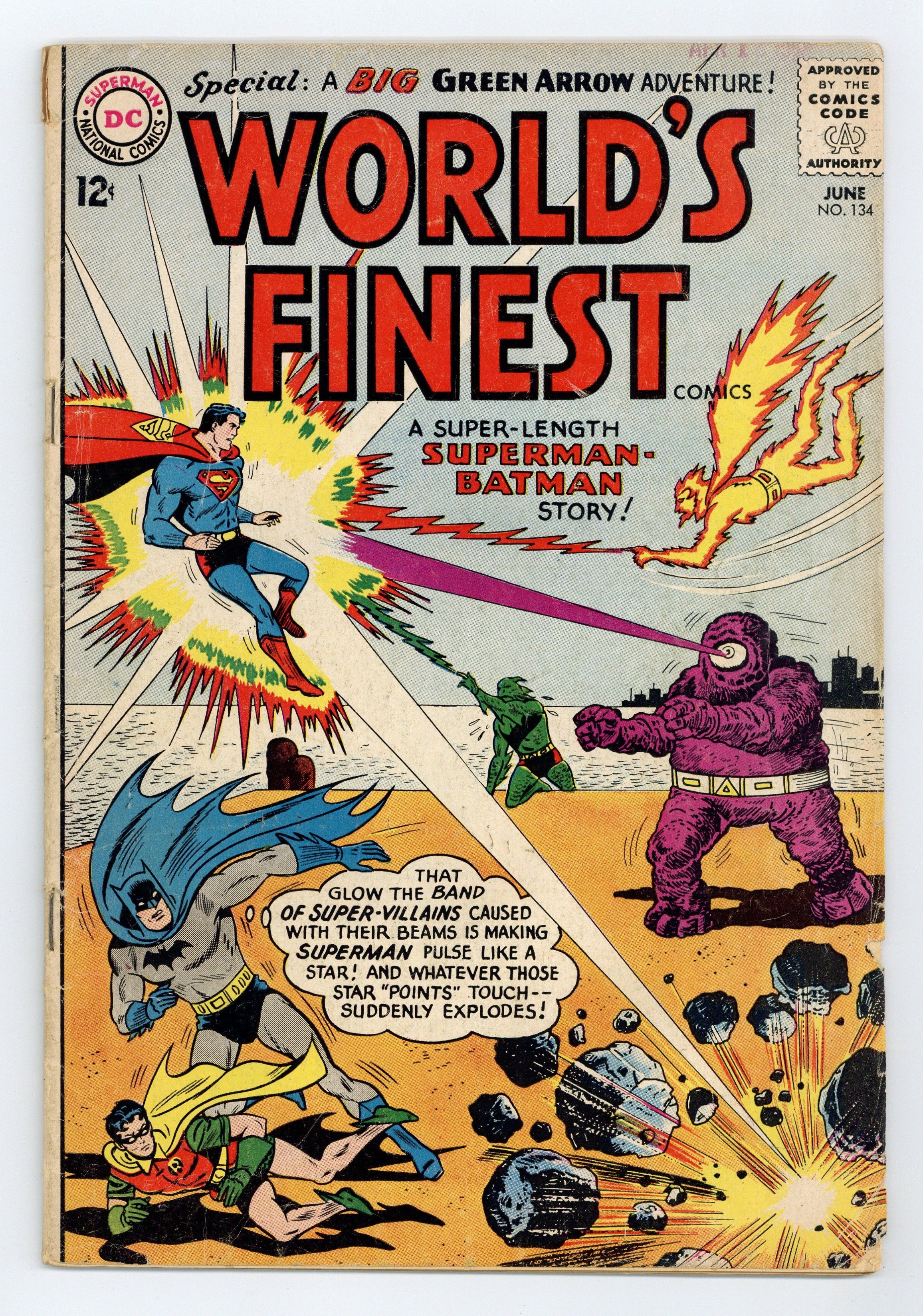 Tags: Superman$16.25Cover pencils by Dick Dillin, inks by Sheldon Moldoff. Not Wanted: High School Dropouts public service announcement, script by Jack Schiff, art by Sheldon Moldoff. The Band of Super-Villains starring Superman and Batman, script by Bill Finger, art by Jim Mooney; An alien gives three criminals belts that give them super powers. These belts, unkown to the users, change the atmostphere of Earth to something suiting the alien. The Mystery Of The Missing Inventors!, script by Ed Herron, art by Lee Elias; Green Arrow, Speedy and Miss Arrowette must stop a gang from stealing an anti-gravity machine and the destructive Z-Ray. 36 Pages, Full Color. Cover price $0.12.