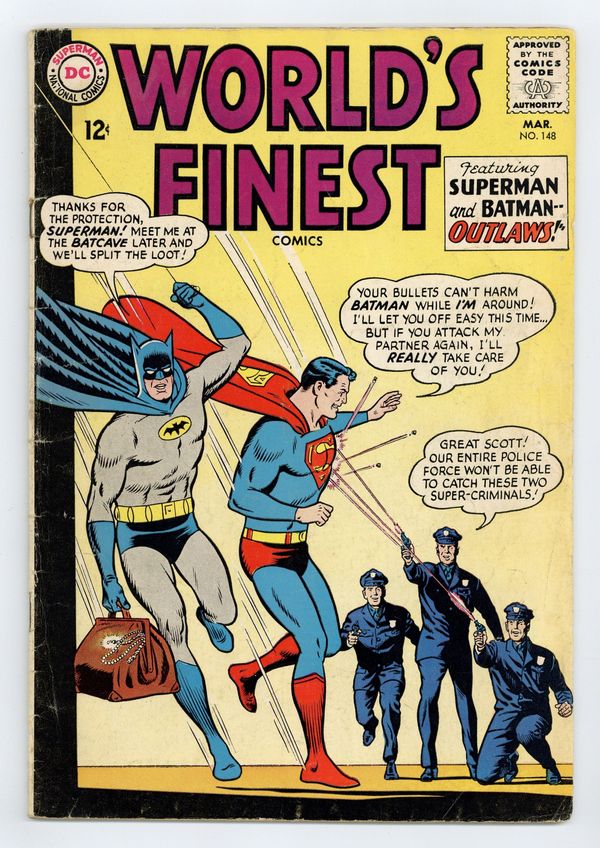 Cover pencils by Curt Swan, inks by George Klein. Superman and Batman- Outlaws Part 1- The Evil Superman and Batman, script by Edmond Hamilton, pencils by Curt Swan, inks by Sheldon Moldoff; Superman and Batman get blown to a parallel Earth where Clayface and Luthor are heroes and Superman and Batman are villains. Part II-The Incredible New Super-Team. Friends Across the Seas public service announcement, script by Jack Schiff, art by Sheldon Moldoff. The Ninth Wonder starring Congorilla, script by Robert Bernstein, art by Howard Sherman; Origin of Congorilla retold. Tricksy humor page by Henry Boltinoff. 36 Pages, Full Color. Cover price $0.12.