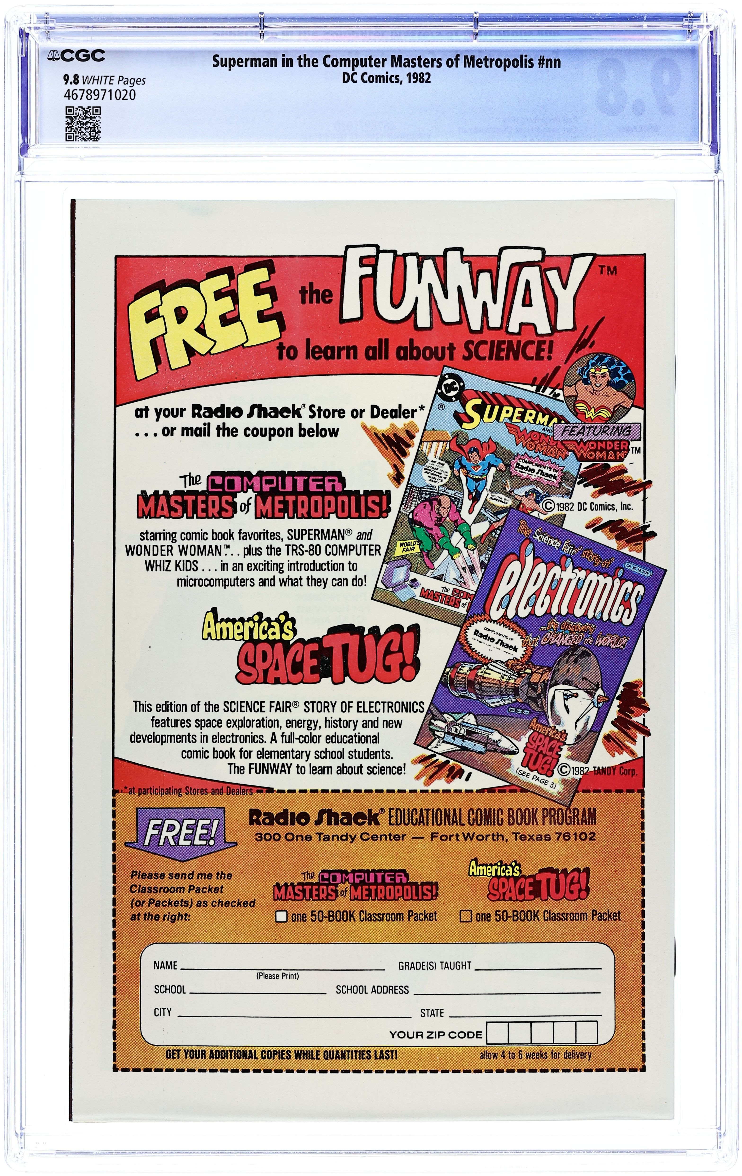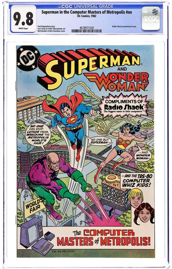 The Computer Masters of Metropolis - Written by Paul Kupperberg. Art by Curt Swan and Frank Chiaramonte. Cover by Rich Buckler and Dick Giordano. Superman and Wonder Woman need the help of Alec and Shanna, with their TRS computers, to stop Lex Luthor from destroying the Metropolis World's Fair. Characters: Superman [Clark Kent]; Wonder Woman [Diana Prince]; Lex Luthor (villain); Alec; Shanna; Ms. Wilson; Mr. Murphy; William Shockley (Nobel winning scientist, cameo); Walter Brattain (Nobel winning scientist, cameo); John Bardeen (Nobel winning scientist, cameo); Cindy. 32 pages, full color.