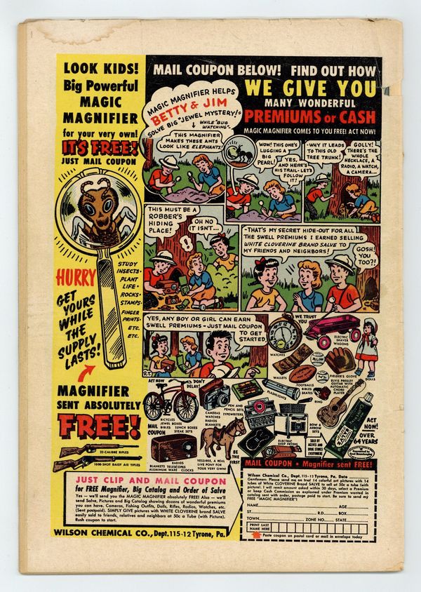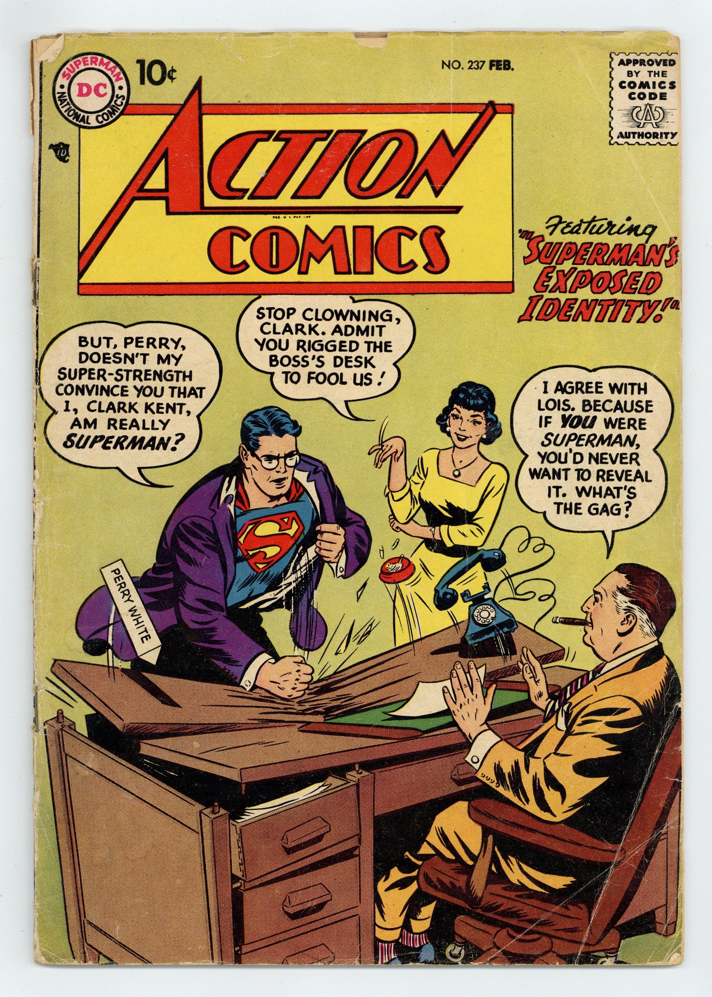 Cover pencils by Curt Swan, inks by Stan Kaye. "Superman's Exposed Identity," script by Alvin Schwartz, pencils by Wayne Boring, inks by Stan Kaye; A newspaper tycoon fakes his own death in order to get Superman to reveal his secret identity to him. 2/3-page Shorty story by Henry Boltinoff. Supermen of America ad. "The Curse of the Golden Touch" starring Tommy Tomorrow and the Nebula Gang, script by Otto Binder, art by Jim Mooney. 2/3-page Funny Facts cartoon by Martin Naydel. "The Jungle Fort on Wheels!" starring Congo Bill and Janu the Jungle Boy, script by Jack Miller, art by Howard Sherman. One-page Tricksy the World's Greatest Stunt Man story by Henry Boltinoff. 36 Pages, Full Color. $.10 "This is Part 1 of 4 of a running gag of covers that homage each other by legendary Superman artist Curt Swan that ran from 1958 to 1963. It is a series of covers I'm calling "The Desk Smash," and they appeared on the covers for Action Comics #237, 264, 284, and 302". – Odinson, mycomicshop.com Archivist. Cover price $0.10.