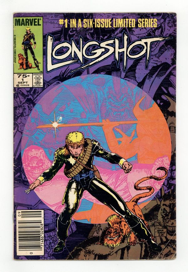 Newsstand Edition. 1st Art Adams pro work. Arriving on Earth unsure of his own identity, Longshot tries to rescue a kidnapped baby in "A Man Without a Past." Script by Ann Nocenti. Pencils by Arthur Adams (his first pro work). Inks by Whilce Portacio & Anderson. Cover by Adams. 1st appearance of Longshot and Spiral. Cover price $0.75.