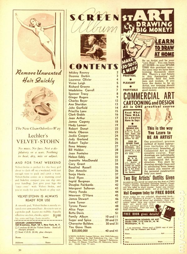 Winter 1939 - Olivia de Havilland cover. Celebrity portraits including Errol Flynn, Clark Gable, Bette Davis, Myrna Loy, Spencer Tracy, Barbara Stanwyck, Loretta Young, Dick Powell, Joan Blondell and many more. All portraits have short biographies. 8 1/-in. x 11 1/2-in., 50 pages, printed in a sepia tone throughout. Cover price $0.10.