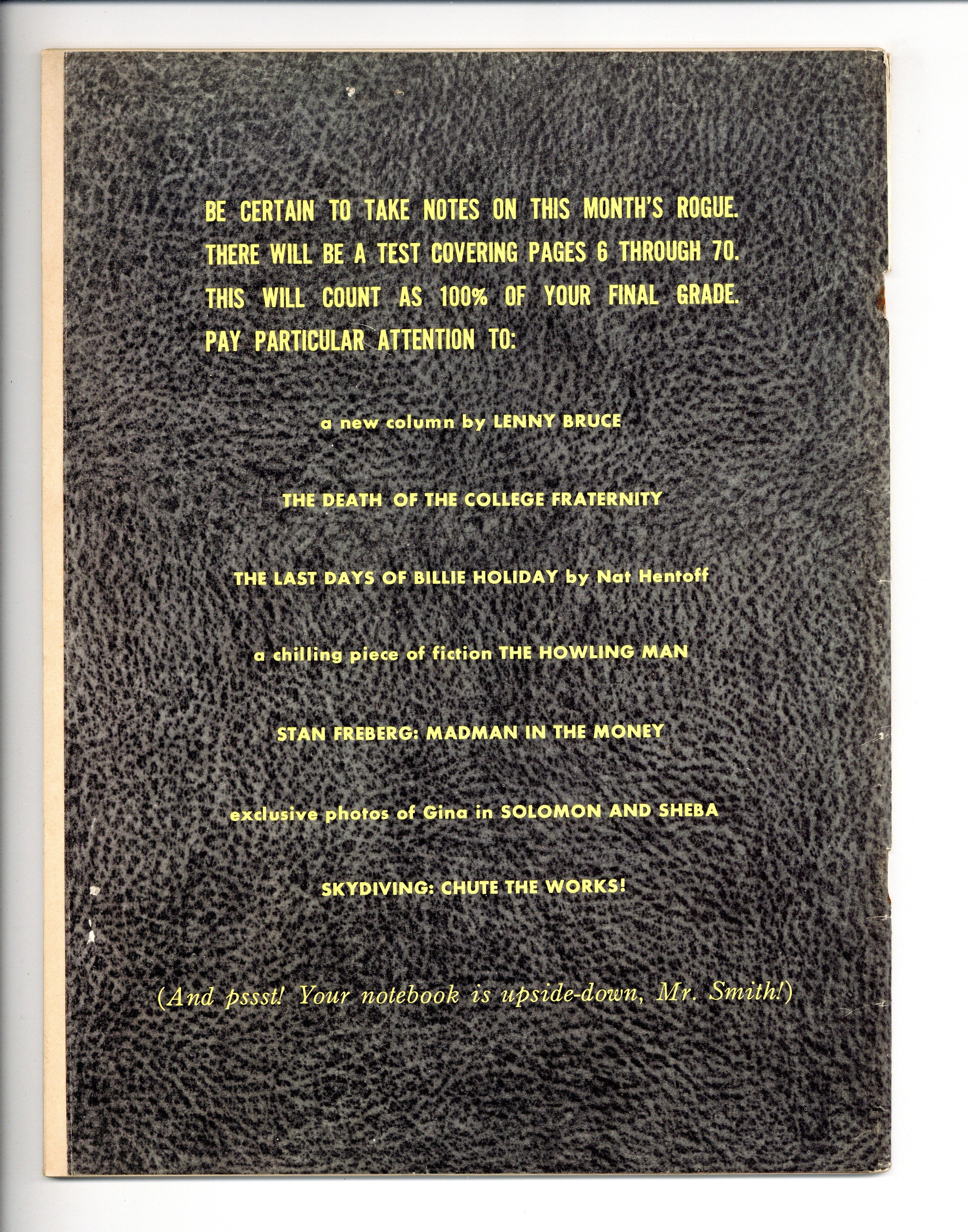 General men's interest magazine. This issue: College issue. Includes a column by Lenny Bruce, The Last Days of Billie Holiday, skydiving and more. 8.25-in. x 10.75-in. 82 pages, PC/PB&W. Mature readers. Cover price $0.50.