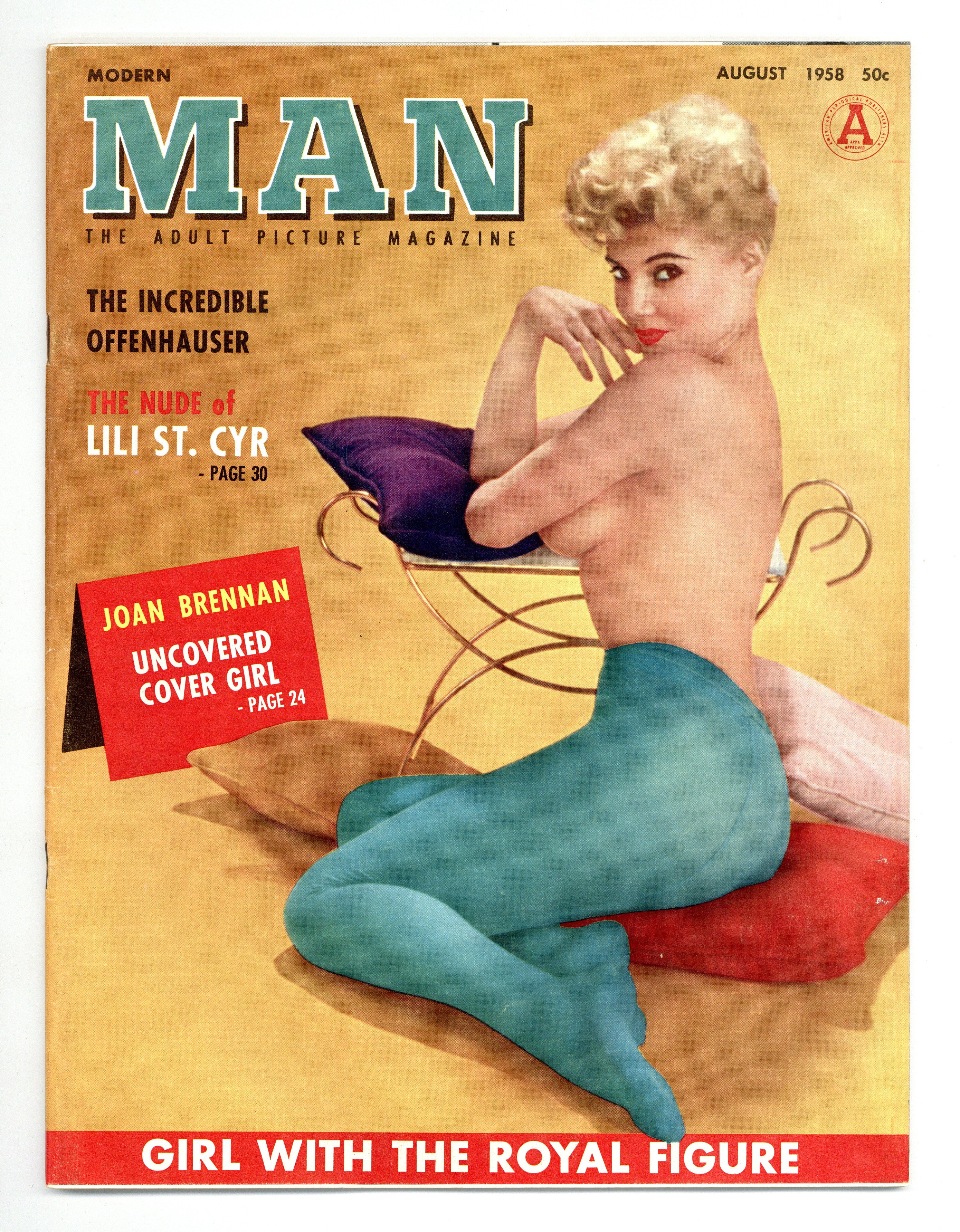 August, 1958 - Vintage Men's Magazine featuring articles, pictorials, and pin-ups. This issue features Uncovered Cover Girl Joan Brennan; Georgia Moore, the model used to paint Princess Margaret from the neck down in a painting universally hated by critics; and Burlesque Legend Lili St. Cyr. 8.5" x 11", 58 pages. PC/PB&W. MATURE READERS Cover price $0.50.