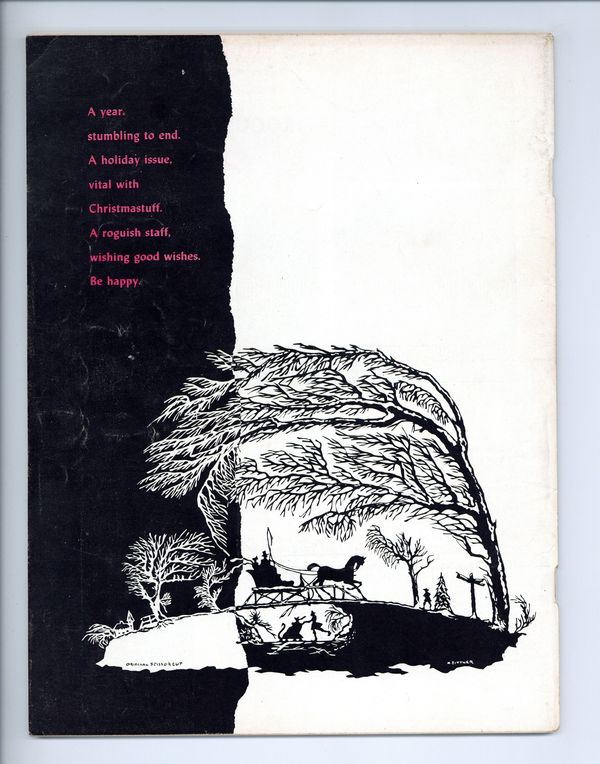 Vol. 4, No. 9 - December 1959. Edited by Frank Robinson, Harlan Ellison, Mack Reynolds among others. Fiction by Richard Matheson, Harlan Ellison and Mack Reynolds. "Eyes of Dust" by Ellison illustrated by Leo Dillon. Lenny Bruce contributes a humorous article written in screenplay format. Pictorials, articles and cartoons round out the issue. 8 1/4-in. x 11-in., 82 pages, B&W and full color. -MATURE CONTENT- Cover price $0.50.