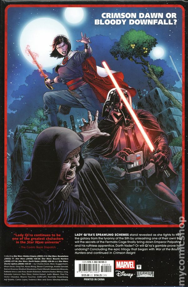 1st printing. Collects Star Wars: Hidden Empire (2022 Marvel) #1-5, Star Wars: Revelations (2022 Marvel), Star Wars (2020-2024) #26-36, Star Wars: Bounty Hunters (2020-2024 Marvel) #27-36, Star Wars: Darth Vader (2020-2024 Marvel) #28-36, Star Wars: Doctor Aphra (2020-2024 Marvel) #22-34. Written by Marc Guggenheim, Charles Soule, Ethan Sacks, Greg Pak, and Alyssa Wong. Art by Salvador Larroca, Justin Mason, Emma Kubert, Wayne Faucher, Steven Cummings, Victor Olazaba, Andres Genolet, Ramon Rosanas, Madibek Musabekov, Andrea Di Vito, Paolo Villanelli, Alessandro Miracolo, Lan Medina, Raffaele Ienco, Luke Ross, Ibraim Roberson, Adam Gorham, Natacha Bustos, and Minkyu Jung. Cover by Paulo Siqueira. The epic trilogy begun in STAR WARS: WAR OF THE BOUNTY HUNTERS and STAR WARS: CRIMSON REIGN concludes! Qiras final plot to take down the Empire! The mysterious criminal syndicate Crimson Dawn and its leader, Lady Qira, have become the galaxys most wanted now that Emperor Palpatine has realized the scope of their plans against him and moves to destroy her. But Qira still has tricks up her sleeve — and with the help of the Knights of Ren and her many other allies, she will not go down without a fight! But as her bid to use an ancient Dark Side weapon known as the Fermata Cage to destroy the Sith falls apart and Darth Vader draws ever nearer, can Qira still salvage victory from certain defeat? The full saga of the Hidden Empire impacts your favorite rebels, the rogue archaeologist Doctor Aphra and the notorious Bounty Hunters! Hardcover, 8 1/2-in. x 11-in., 1,176 pages, full color. Rated T Cover price $125.00.