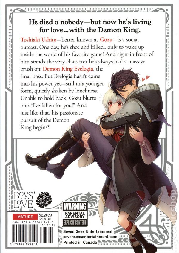 Volume 1 - 1st printing. Story and art by Io Kajiwara. Translated by Niioka. The Boys Love manga that inspired the anime! A man is transported into the video game he played as a child and finally has his chance to team up with the powerful Demon King, whom he's always been in love with! Toshiaki Ushito—better known as Gozu—is a social outcast. One day, he's shot and killed… only to wake up inside the world of his favorite game! And right in front of him stands the very character he's always had a massive crush on: Demon King Evelogia, the final boss. But Evelogia hasn't come into his power yet—still in a younger form, quietly shaken by loneliness. Unable to hold back, Gozu blurts out: I've fallen for you! And just like that, his passionate pursuit of the Demon King begins?! Softcover, 5-in. x 7-in., 160 pages, B&W. Mature Readers Cover price $15.99.
