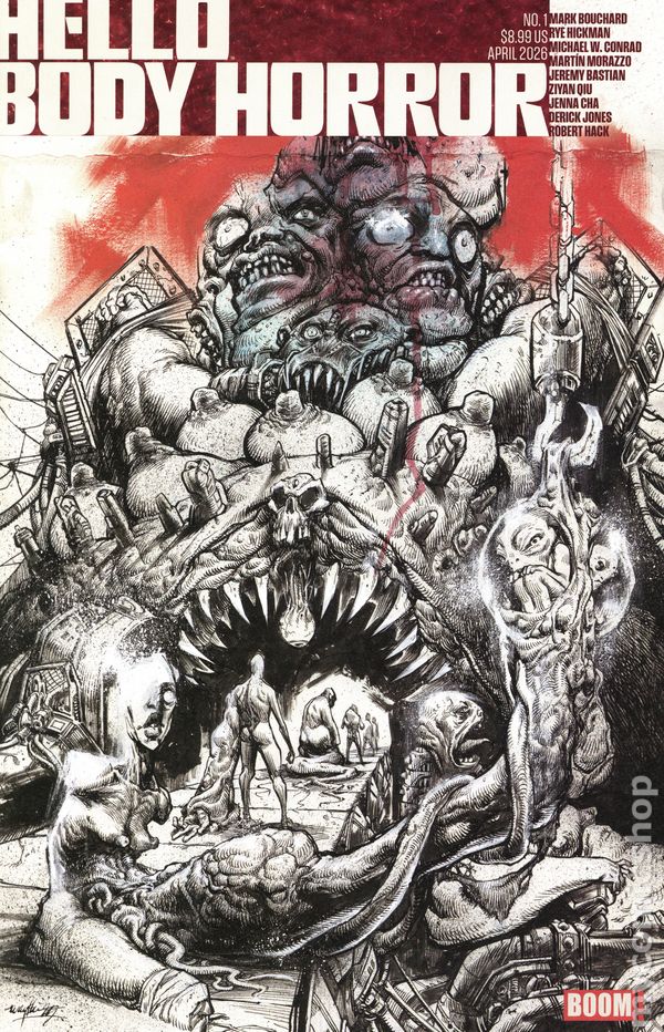 (W) Mark Bouchard; Various (A) Rye Hickman; Various (CA) Jonathan Wayshak New forms of fear are bursting onto the scene with this newest curation of jaw-breaking talent!Test your nerves and prove your guts with the grossest, squishiest, gruesomest comics in… Hello Body Horror, a fresh collection of spine-cracking tales and stomach-churning terrors!In “Body Positive” by Mark Bouchard and Rye Hickman, a fitness influencer striving for greatness has her mind go where her body cannot follow...yet.In “Minimal Scarring” by indie sensation Derick Jones, a plastic surgeon who caters to the ultra-rich uses what pieces they leave behind to transform himself.Also featuring stories by Michael W. Conrad, Martín Morazzo, Jeremy Bastian, Ziyan Qiu, Jenna Cha, and Robert Hack for a veritable “Who’s Who” in “Kill U Comics!” 48 pages, full color, rated mature. Cover price $8.99.