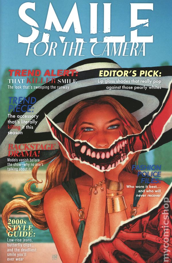 View scanLimited 1 for 50 Retailer Incentive Variant Cover. (W) Hannah Rose May (A) Miriana Puglia (CA) Martin Simmonds Pose. Vogue. Couture. Gore.Its Fashion Month 2005. Five young international models have just landed in New York City, ready to tackle four grueling weeks of runways, press, and cameras as they try to make it big. The girls become fast friends…until one seems to crack under the pressure. Little does everyone know that she is afflicted by the entity, a being bent on destruction and pain as it seeks to destroy lives through its horrific visions.Dive into this never-before-seen story of betrayal and reality bending, based on the critically-acclaimed SMILE film franchise from Parker Finn, brought to you by horror star Hannah Rose May (The Exorcism at 1600 Penn, Rogues Gallery) and Miriana Puglia (Disney Villains: Cruella de Vil, Disney Villains: Maleficent) as we follow these models glamorous, gory descent into insanity.Get ready to smile like you mean it. 32 pages, rated M, Full color Cover price $4.99.