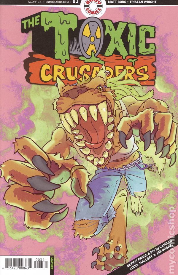 (W) Matt Bors (A) Tristan Wright (CA) Tristan Wright Continuing the all-new, 21st century adventures of the Toxic Avenger and his bizarre team. The villainous Mr. K turns three disgraced former police officers into hideous mutants! They will huff and puff and don't need a warrant to blow your house down! In other housing news, an eviction notice appears at Crusaders HQ! 28 pages, rated Mature, Full Color Cover price $4.99.