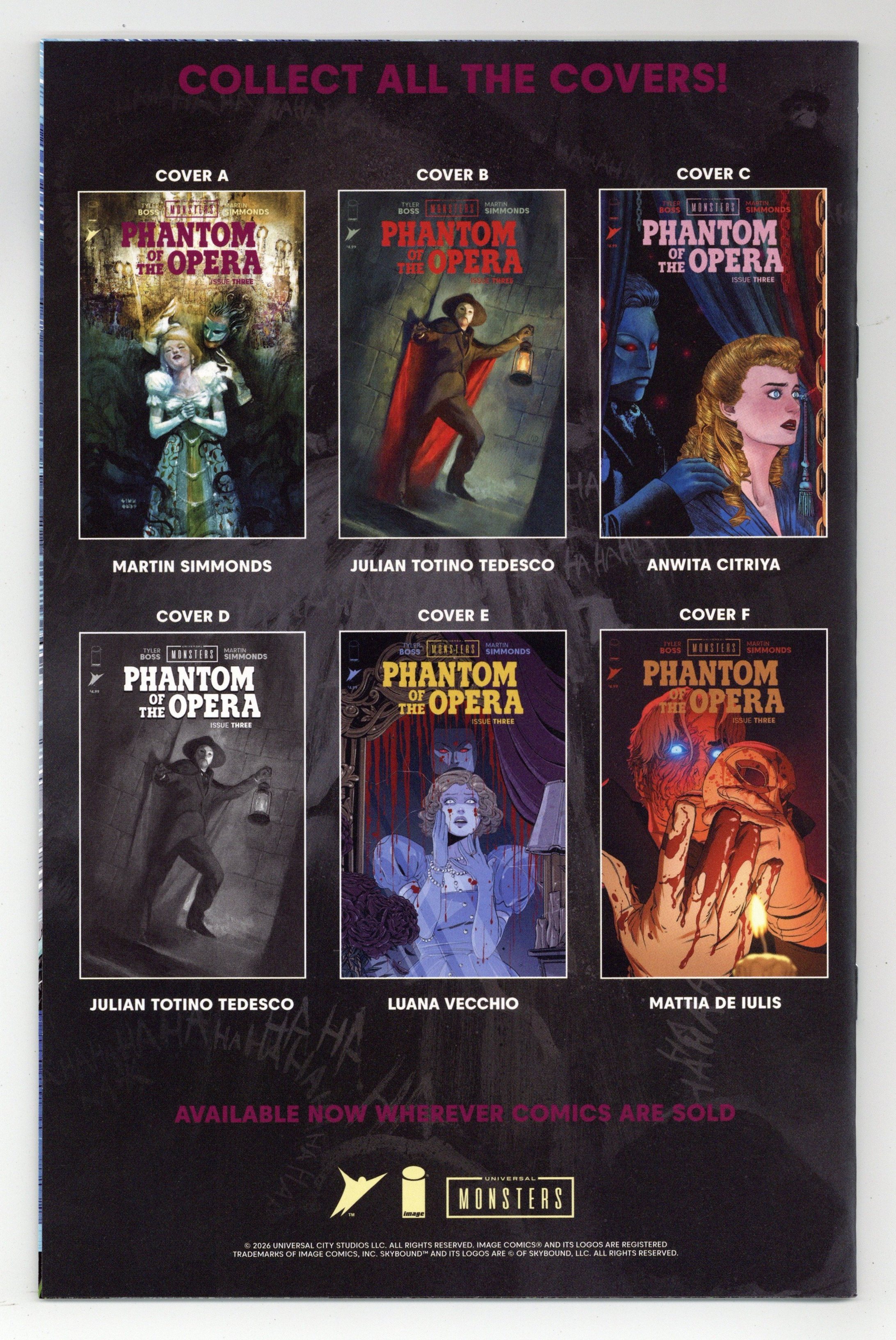$40.00Limited 1 for 75 Retailer Incentive Variant Cover. (W) Tyler Boss (A) Martin Simmonds (CA) Mattia De Iulis Raoul and the police launch a desperate gambit to catch Pariss most wanted criminal, but the Phantom of The Opera is one step ahead of them...and makes his move for Christine. 32 pages, full color, rated T+. Cover price $4.99.