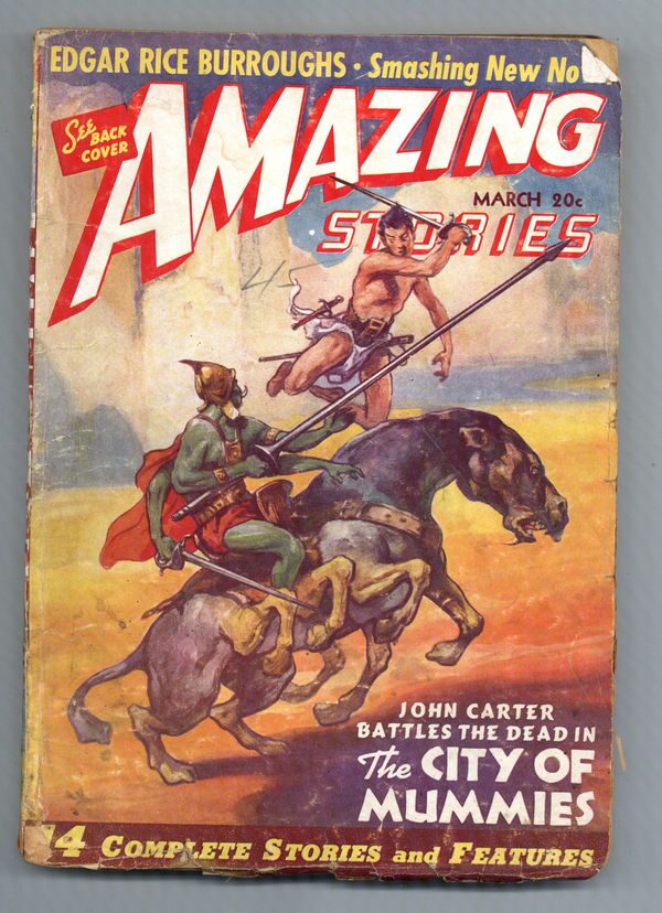 Volume 15, Issue 3 - March, 1941. John Carter cover by J. Allen St. John. Stories by Edgar Rice Burroughs (John Carter in "The City of Mummies"), David Wright O'Brien, John York Cabot, Manly Wade Wellman, John Beynon, James Norman, and Donald Bern. Illustrations by J. Allen St. John, Leo Morey, Jay Jackson, Guy Gifford, Joe Sewell, Julian S. Krupa, Dick Shaw, and Robert Fuqua. Back cover by Frank R. Paul. 7" x 10"; black and white with color cover; 148 newsprint pages. Cover price $0.20.