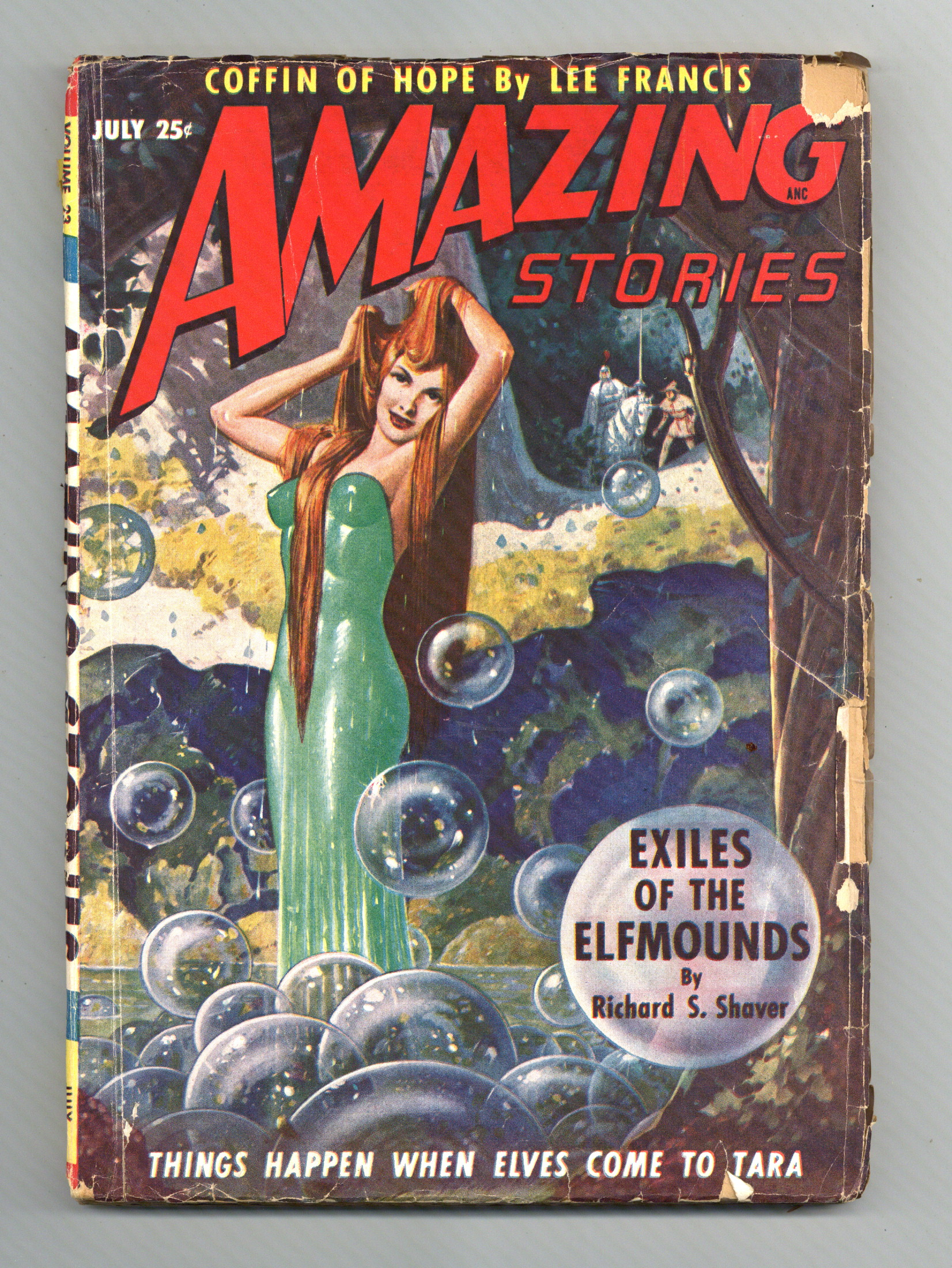 Volume 23, Issue 7 - July, 1949. Science fiction stories by Richard S. Shaver, Lee Francis, Cavid C. McGowan, Rog Phillips, Ruppert Carlin, Charles Recour, G.L. Cleggett, and Guy Archette. Illustrations by Murphy Anderson (2 stories), Edmond B. Swiatek, Rod Ruth, and Julian S. Krupa. Cover by Robert Gibson Jones. 7-in. x 10-in.; black and white; 148 newsprint pages. Cover price $0.25.
