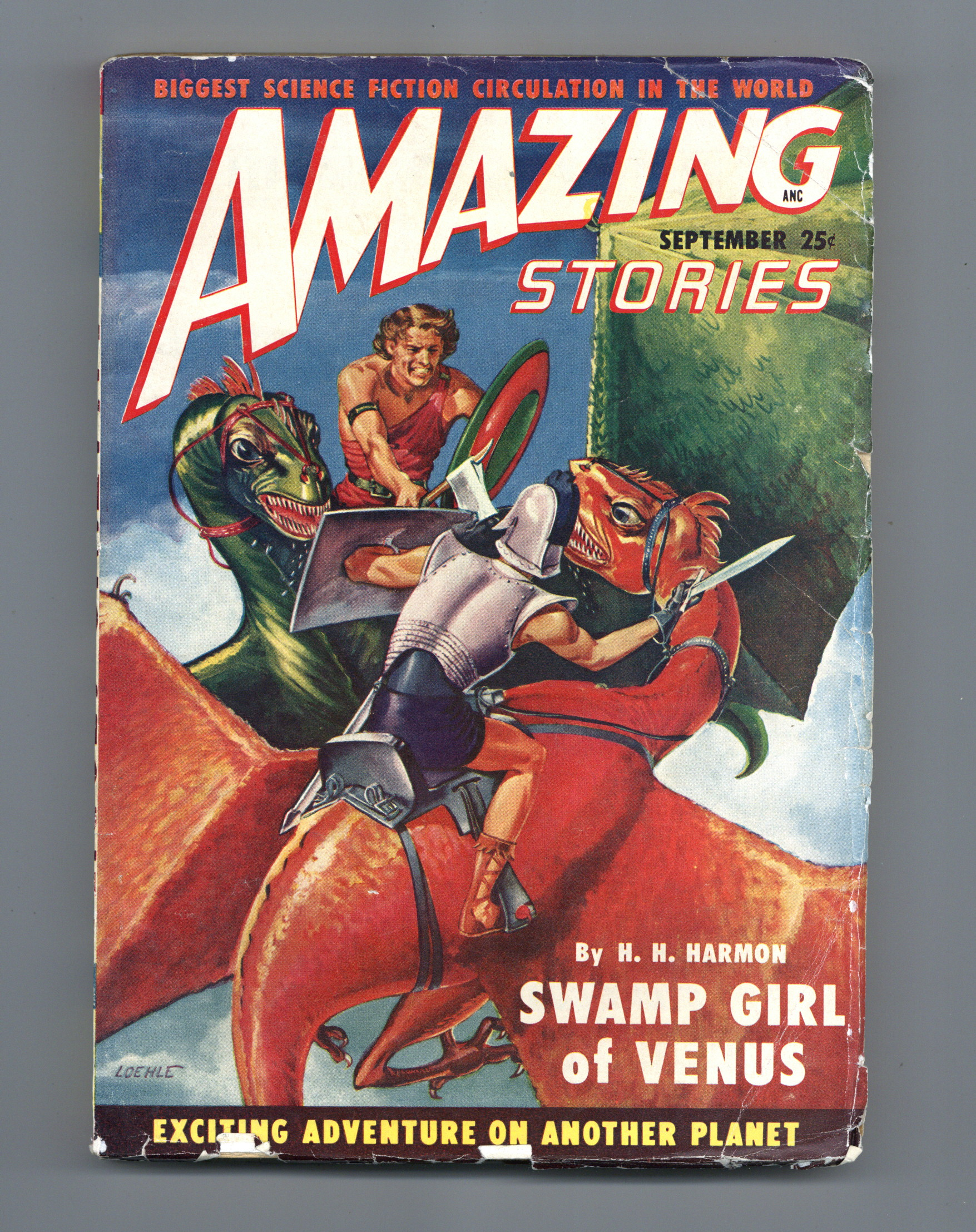 Volume 23, Issue 9 - September, 1949. Science fiction stories by Robert Moore Williams, H.H. Harmon, Richard S. Shiver, Richard Ashby, and George D. Lewis. Illustrations by J. Allen St. John, Robert Keys, Richard Loehle, and Bill Terry. Cover by Richard Loehle. 7-in. x 10-in.; black and white; 162 newsprint pages. Cover price $0.25.