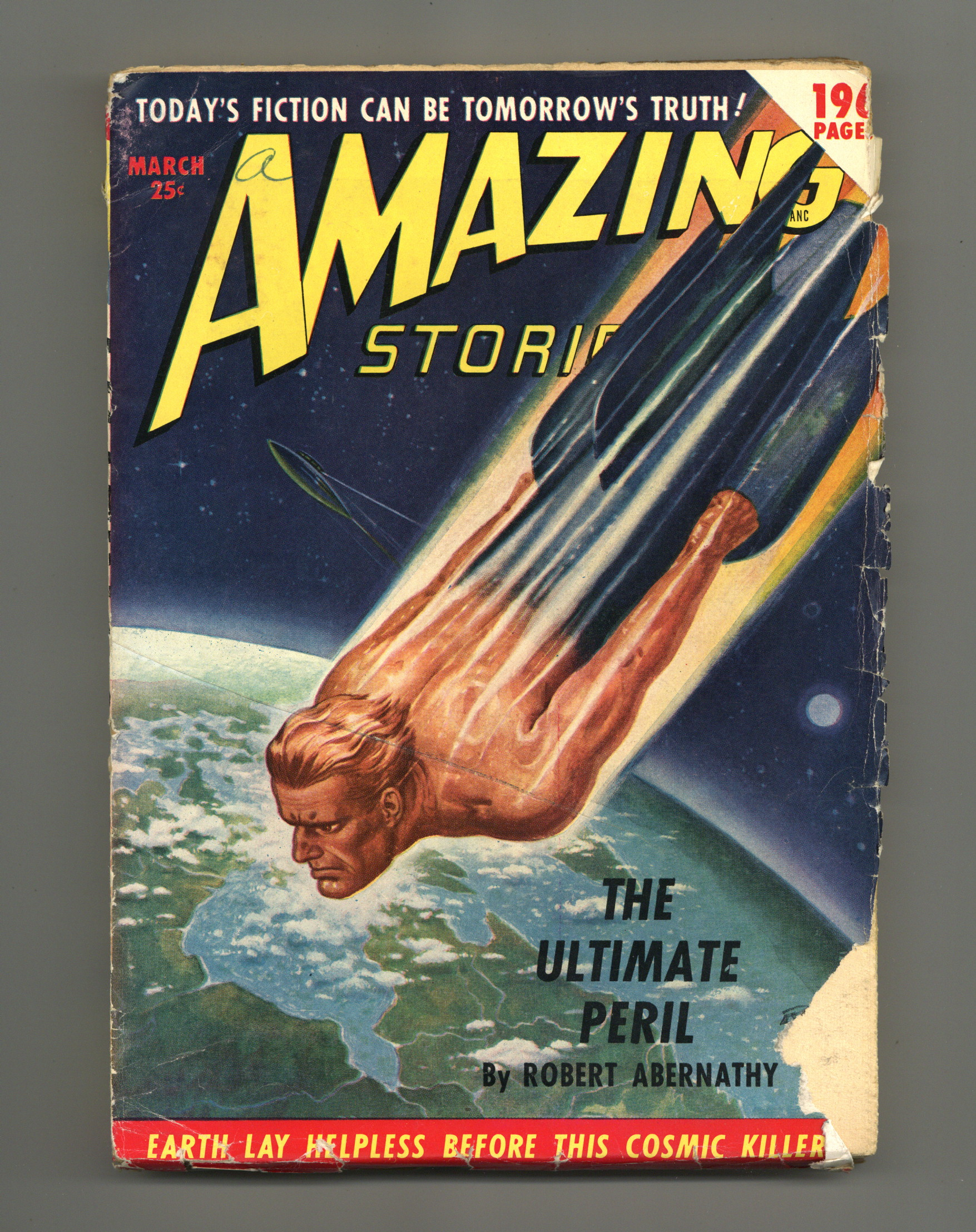 Volume 24, Issue 3 - March, 1950. Cover by Robert Gibson Jones. Science fiction stories by Robert Abernathy "The Ultimate Peril", H.B. Hickey, E.K. Jarvis, William F. Temple, Ward Moore, and Craig Browning. Illustrations by Leo Ramon Summers, Edmond Swiatek, Rod Ruth, and Julian S. Krupa. 7-in. x 10-in.; black and white; 196 newsprint pages. Cover price $0.25.