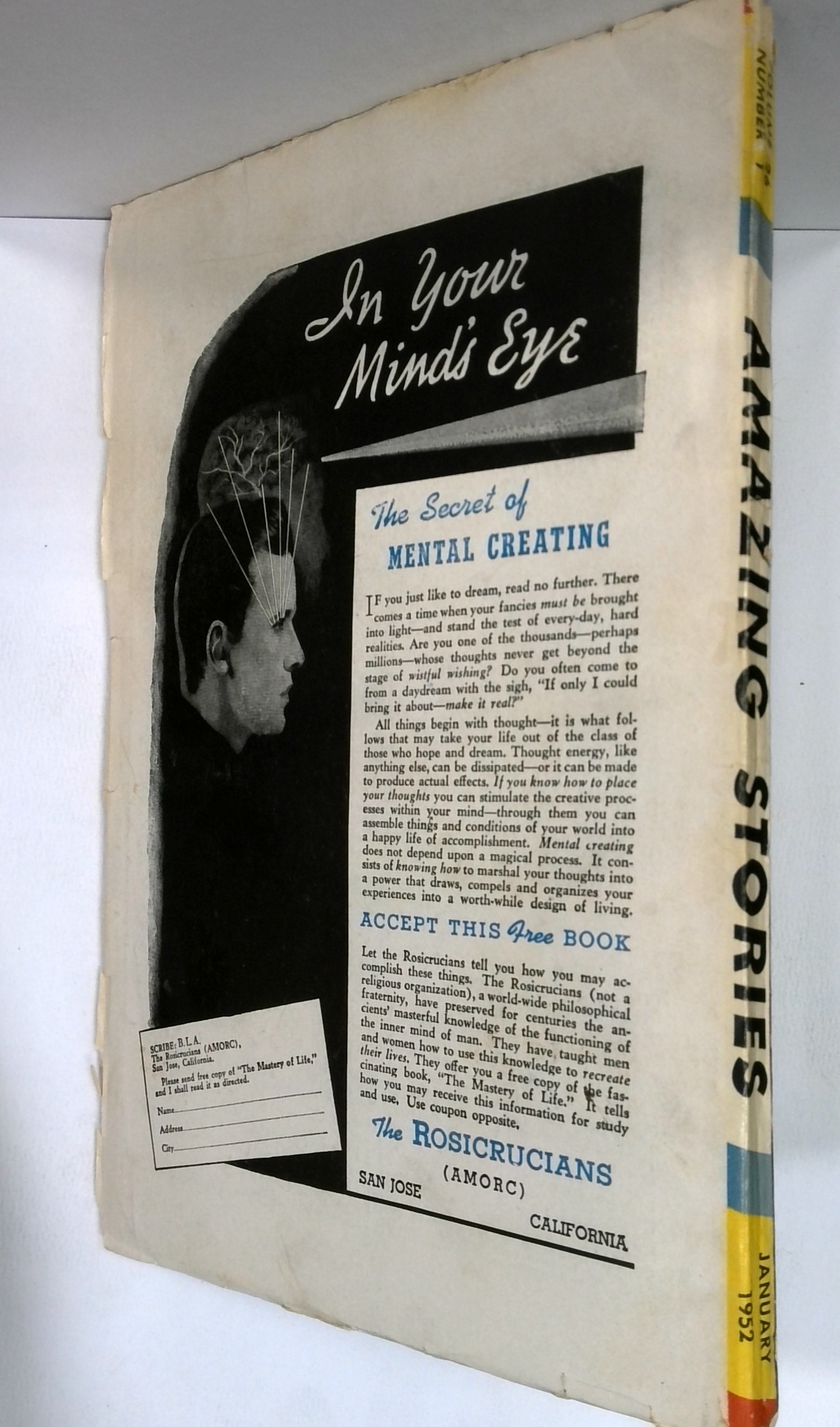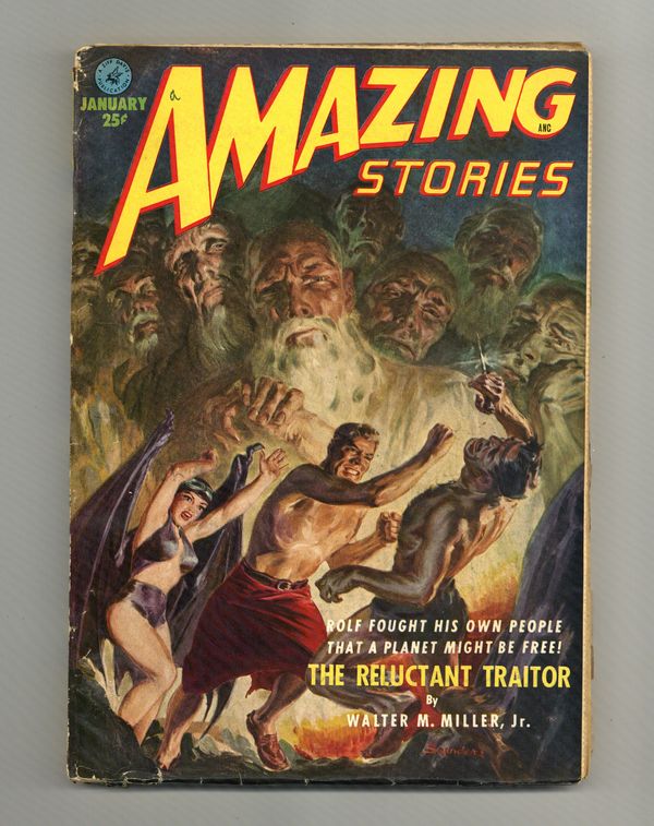 Jan 1952. Cover by Norman Saunders. Science fiction stories by Walter M. Miller Jr., Stephen Marlowe, Gerald Vance, Milton Lesser, and Rog Phillips. Illustrations by James Otis, Ed Emsler, Gene Fawcette, Ed Valigursky, and Julian S. Krupa. 7-in. x 10-in.; black and white; 162 newsprint pages. Cover price $0.25.