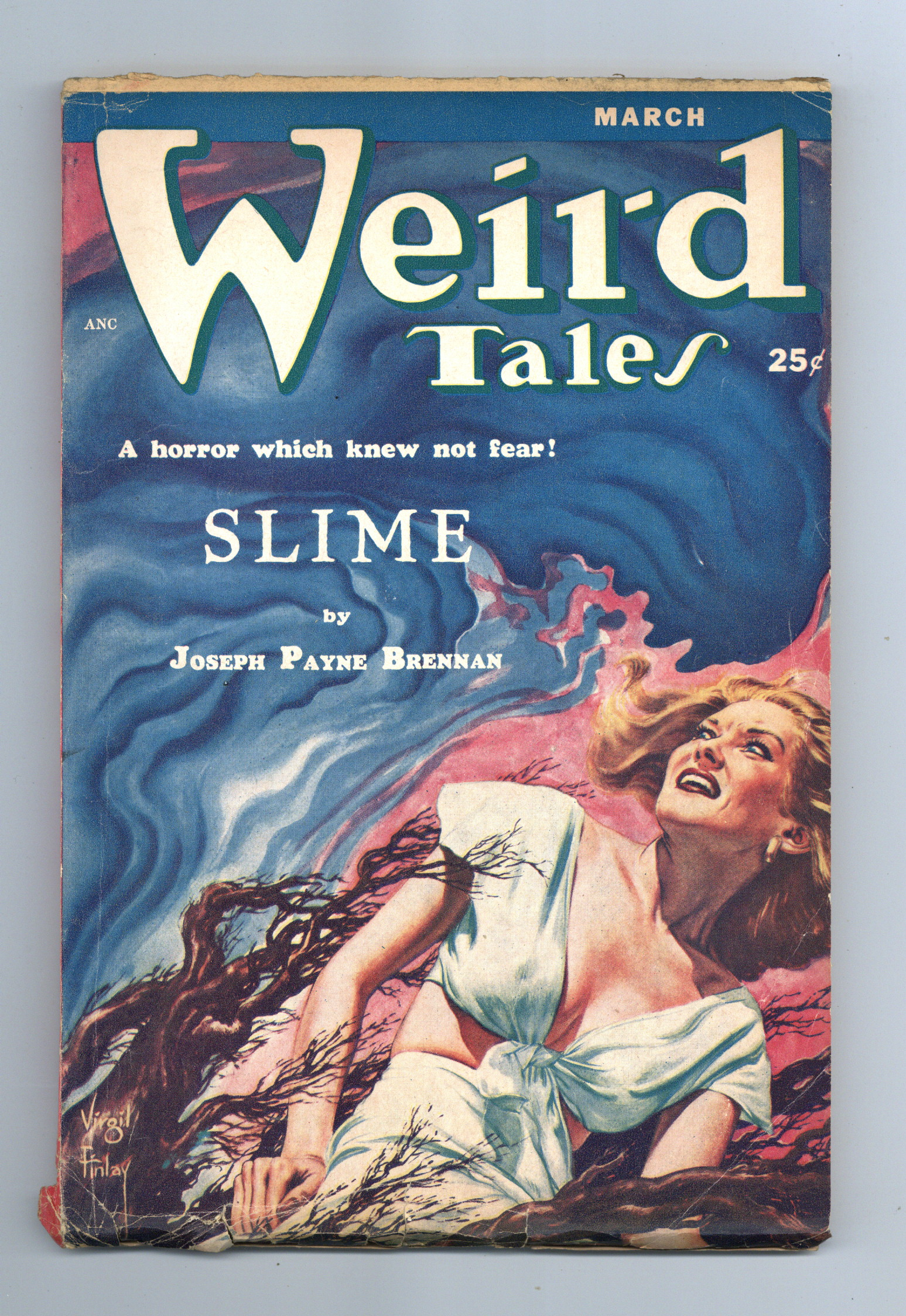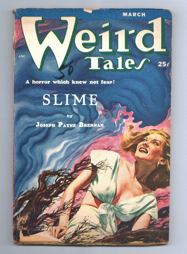 Published Mar 1953 by Weird Tales.$51.00March 1953. Cover by Virgil Finlay. Horror and supernatural fiction by Joseph Payne Brennan "Slime", Donald F. Vieweg, L. Sprague De Camp & Fletcher Pratt "Caveat Emptor", Mary Elizabeth Counselman, John Ward, Kirk Shaw, T. W. Speight, Harold Lawlor, and Appleby Terrill. Illustrations by Virgil Finlay, Jon Arfstrom, Joseph Eberle, and W. H. Silvey. 6 3/4" x 10"; black and white; 96 newsprint pages. Cover price $0.25.