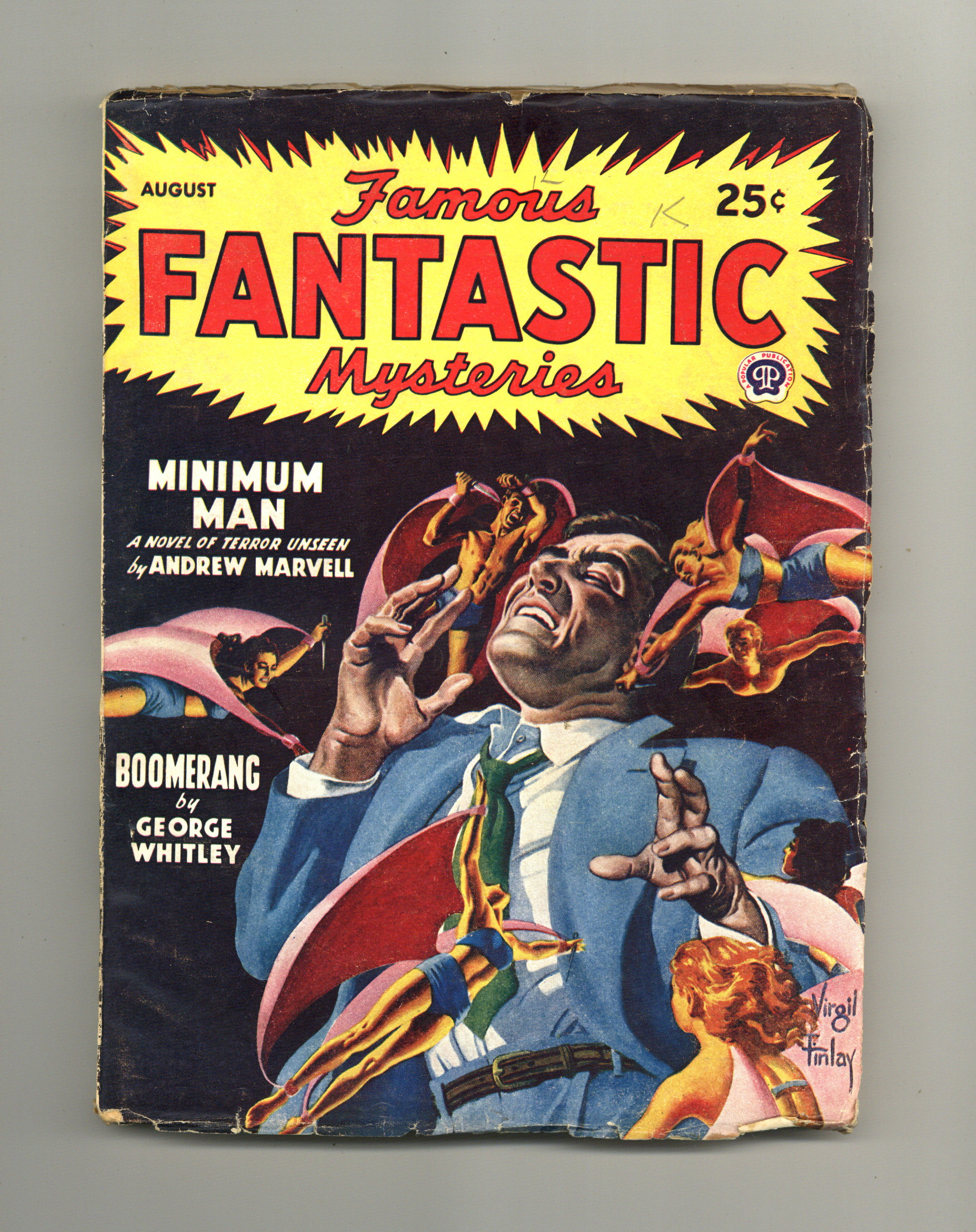 Volume 8, Issue 6 - August, 1947. Cover by Virgil Finlay. "Minimum Man, or, Time to Be Gone" by Andrew Marvell, and "Boomerang" by George Whitley. Interior Illustrations by Lawrence, Bok, and Austin. 7-in. x 9 1/2-in.; 134 Pages, B&W. Published by Popular Publications Cover price $0.25.
