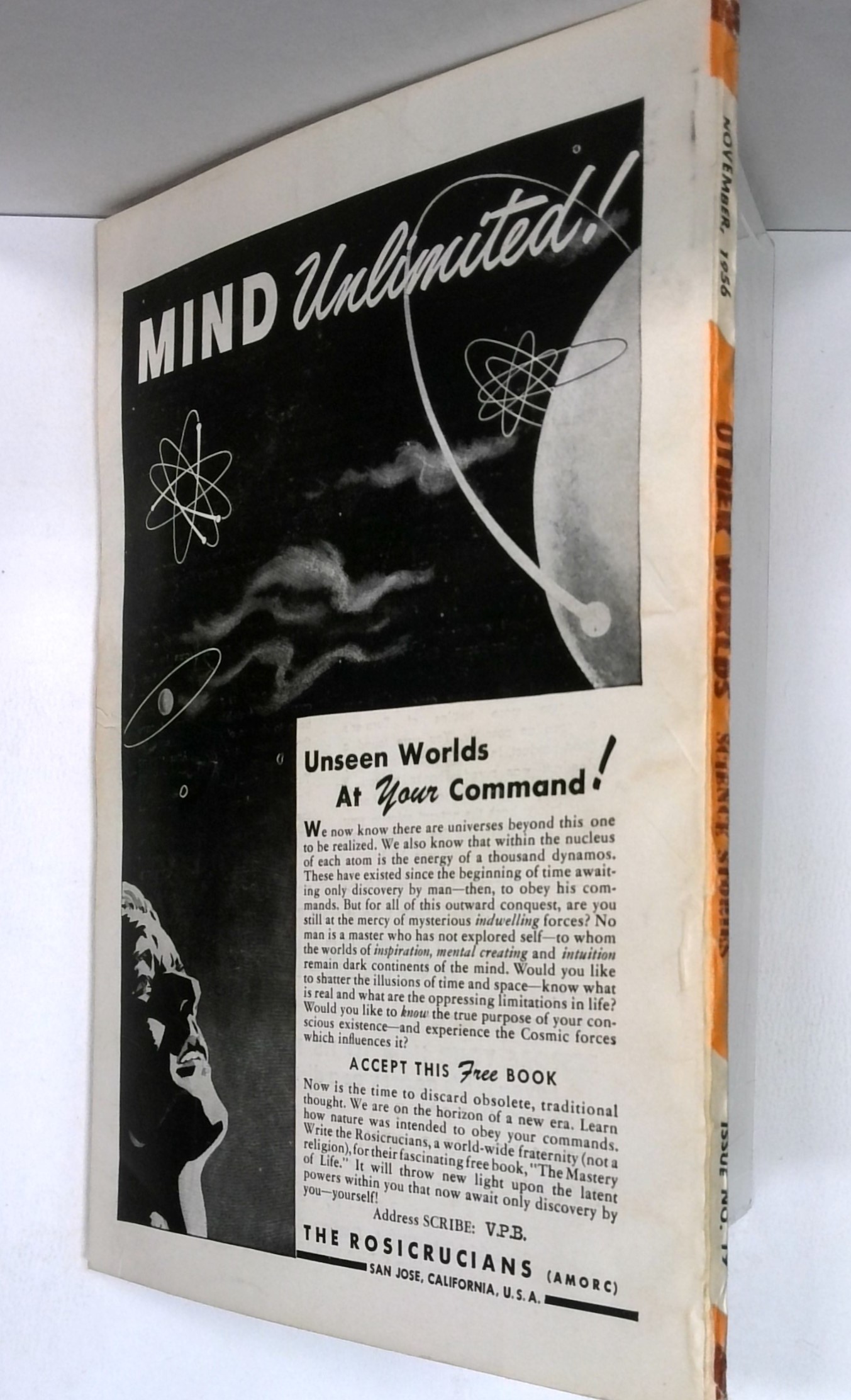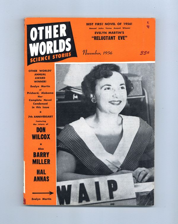 November 1956. Photo cover of Evelyn Martin. "Reluctant Eye" by Evelyn Martin, "My Head is Ticking" by Hal Annas, "The Dimensional Wasp" by Barry Miller, and "The Fires of Kessa" by Don Wilcox. 5-in. x 7 1/2-in.; black and white; 100 pages. Cover price $0.35.