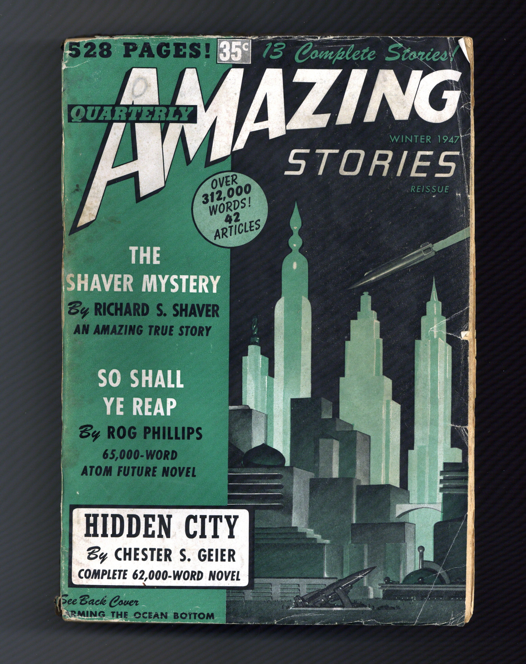 Winter 1947. All issues in this series consist of three remaindered/coverless copies of unsold Amazing Stories (not reprints) re-bound together by Ziff-Davis into a single thick volume with new outer cover art. 6.75" x 9.75", 528 pages, B&W. Cover price $0.35.